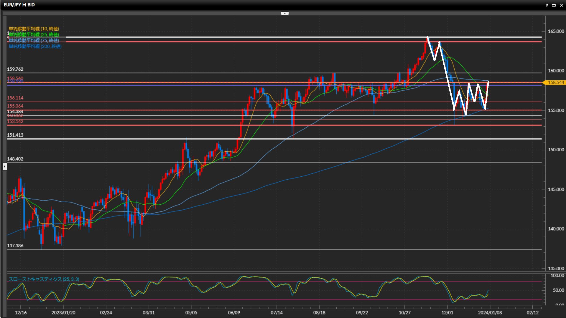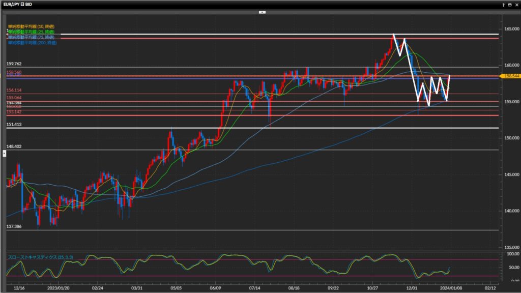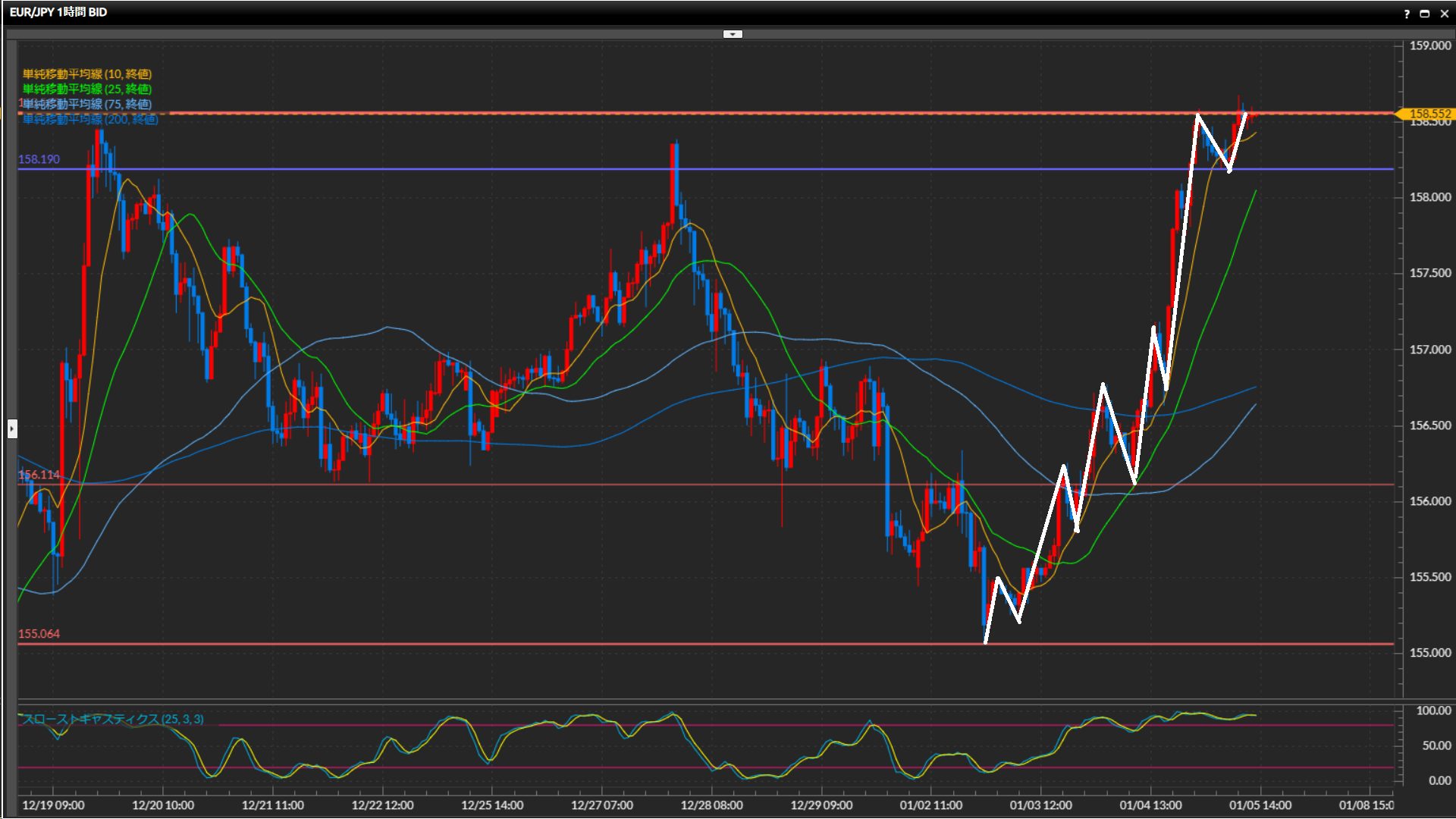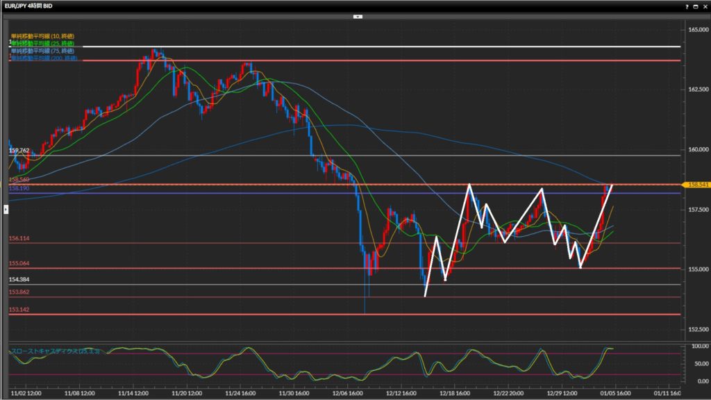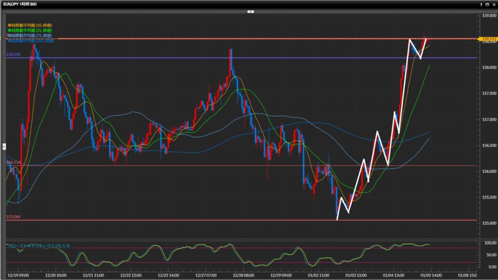 年明けからの強い上昇が継続中。水平線158.56円を突破できるか注目。