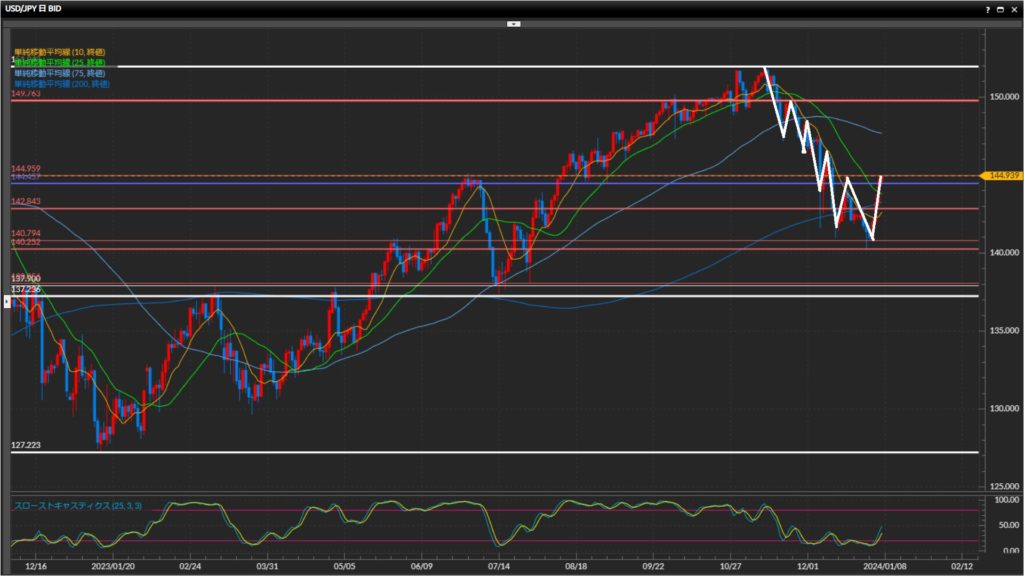直近安値は142.84円で、下抜けない限りは上目線。