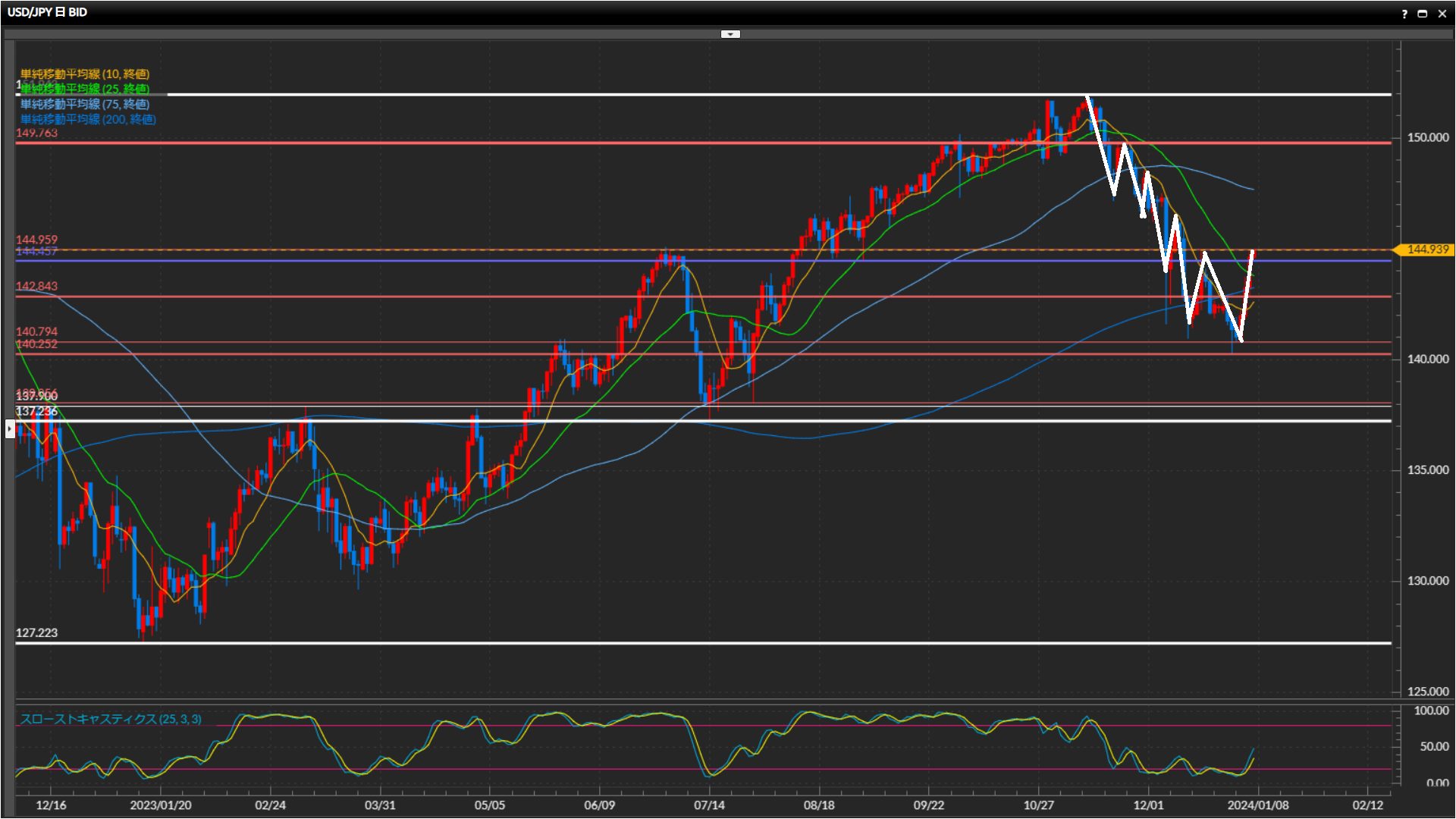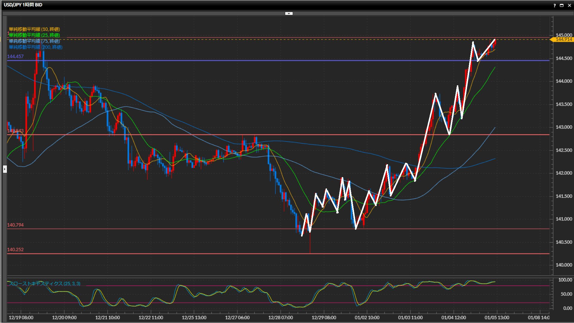 基本はロング狙いで、押し目形成or足元で上値を抑えている水平線144.96円を上抜け確定したらエントリータイミングを探る。