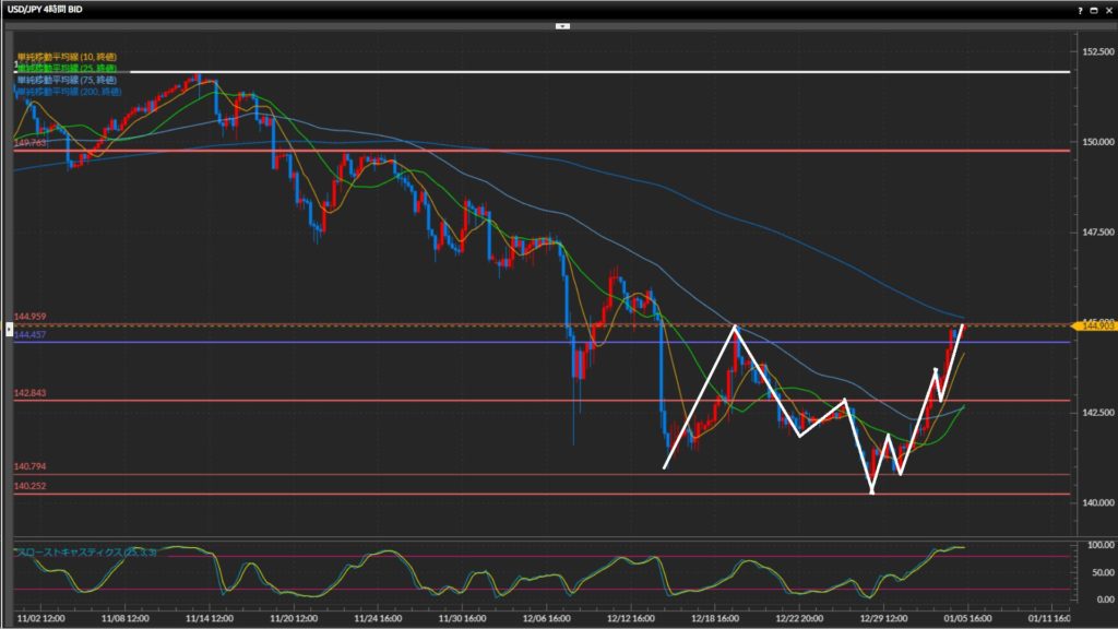 4時間足水平線144.96円手前で上昇一服。