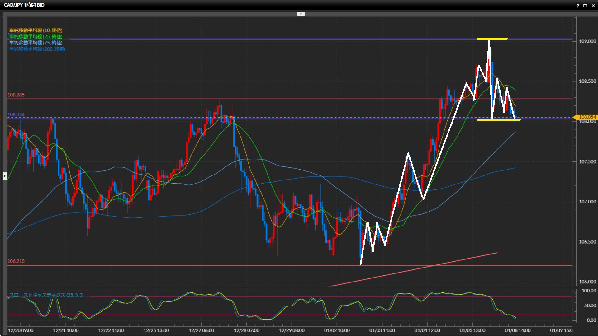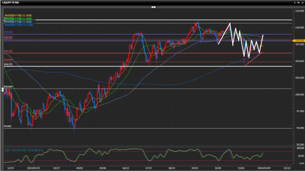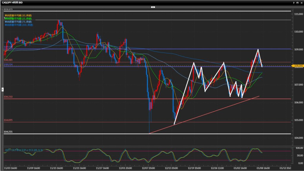 - 加ドル円は日足はレンジ、4時間足は下目線終了、1時間足はレンジ。