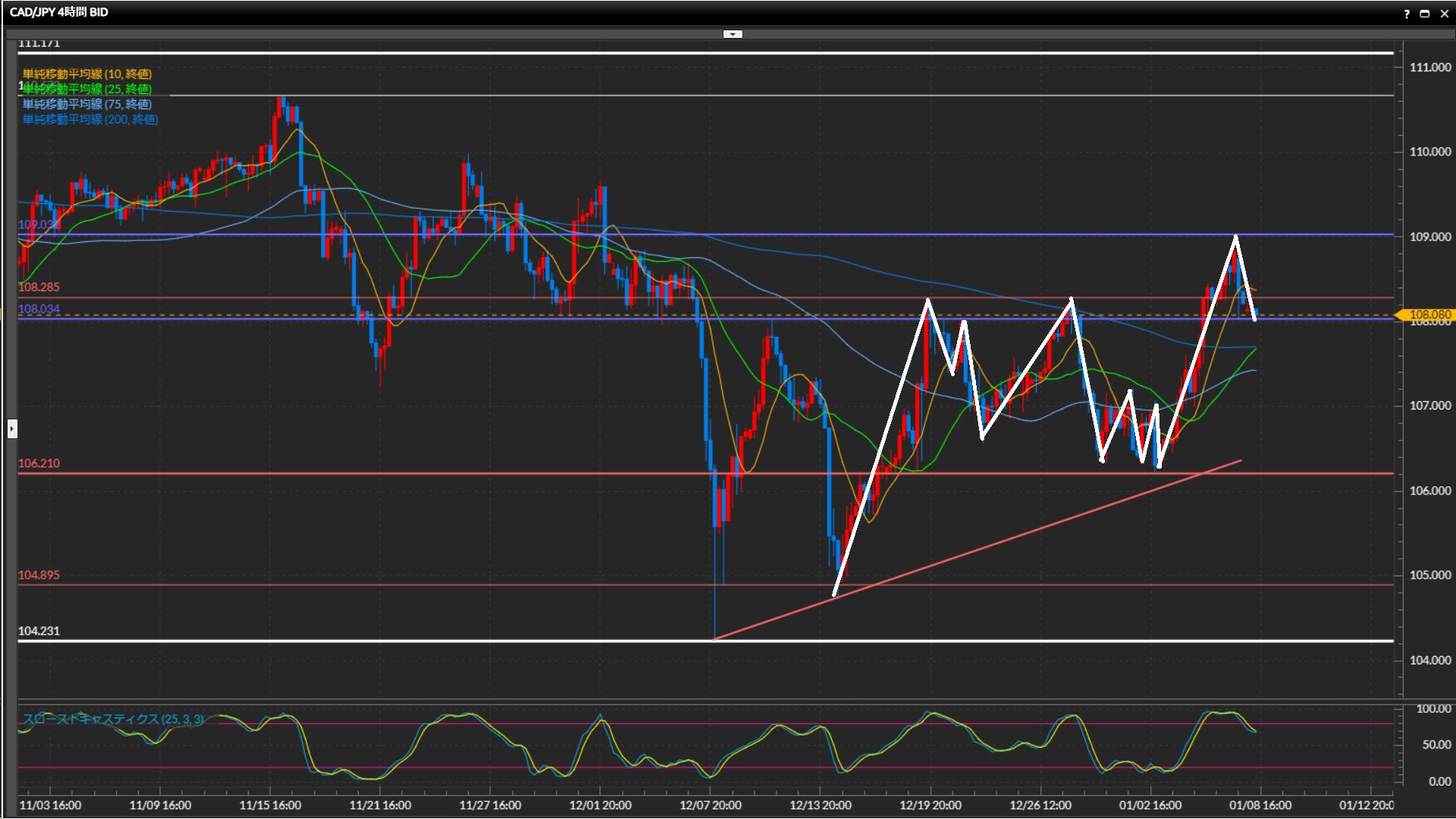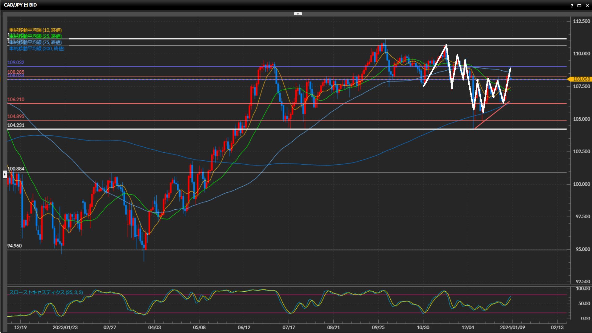 直近高値108.29円を上抜けているものの、その後は下落しておりまだ方向が微妙。