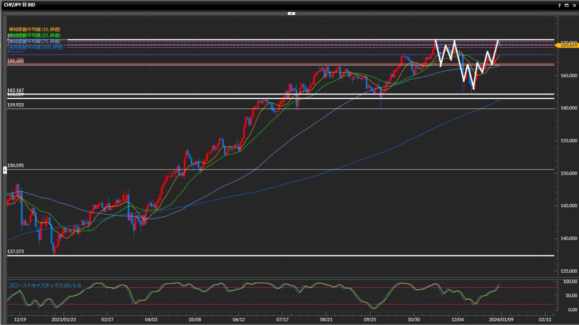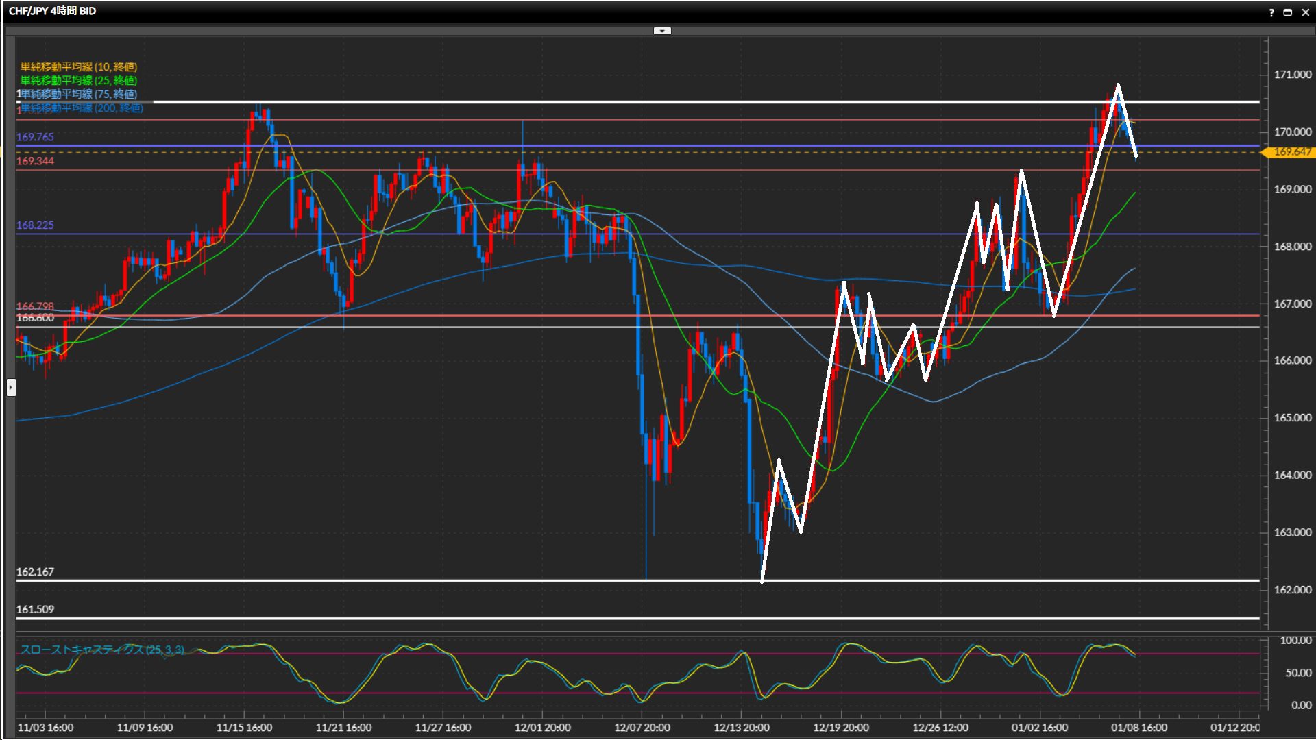 先週末に最高値170.53円を更新したものの、ひげ足では上抜け確定出来ず。