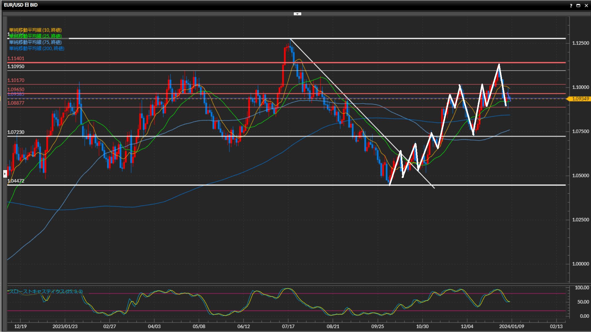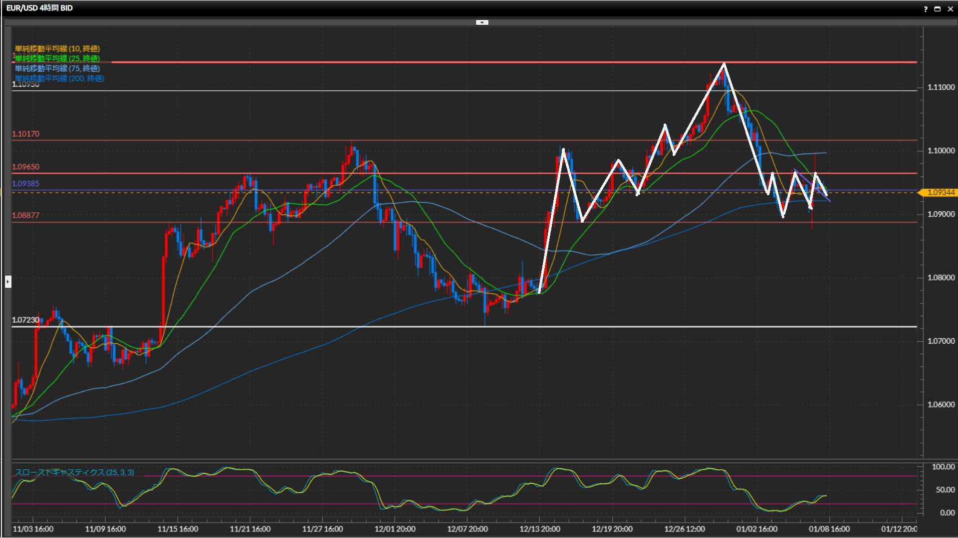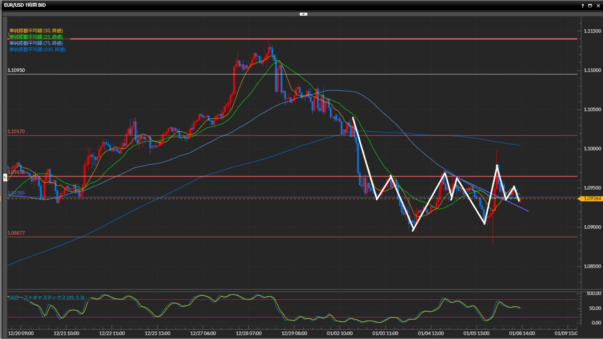 水平線1.0888ドル-1.0965ドルをひげ足で上下に抜けており、方向感が微妙。
