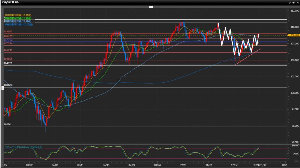 - 加ドル円は日足は上目線、4時間足は下目線終了、1時間足は上目線。
