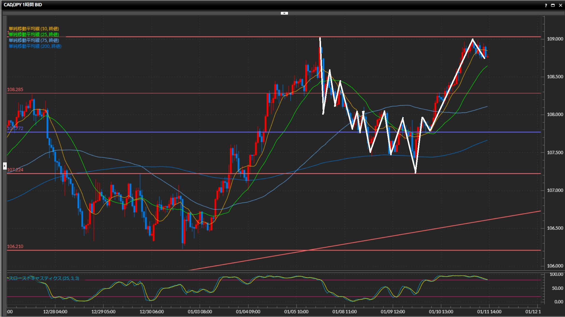 4時間足水平線109.03円にぶつかって停滞中で、10SMAを下抜け。