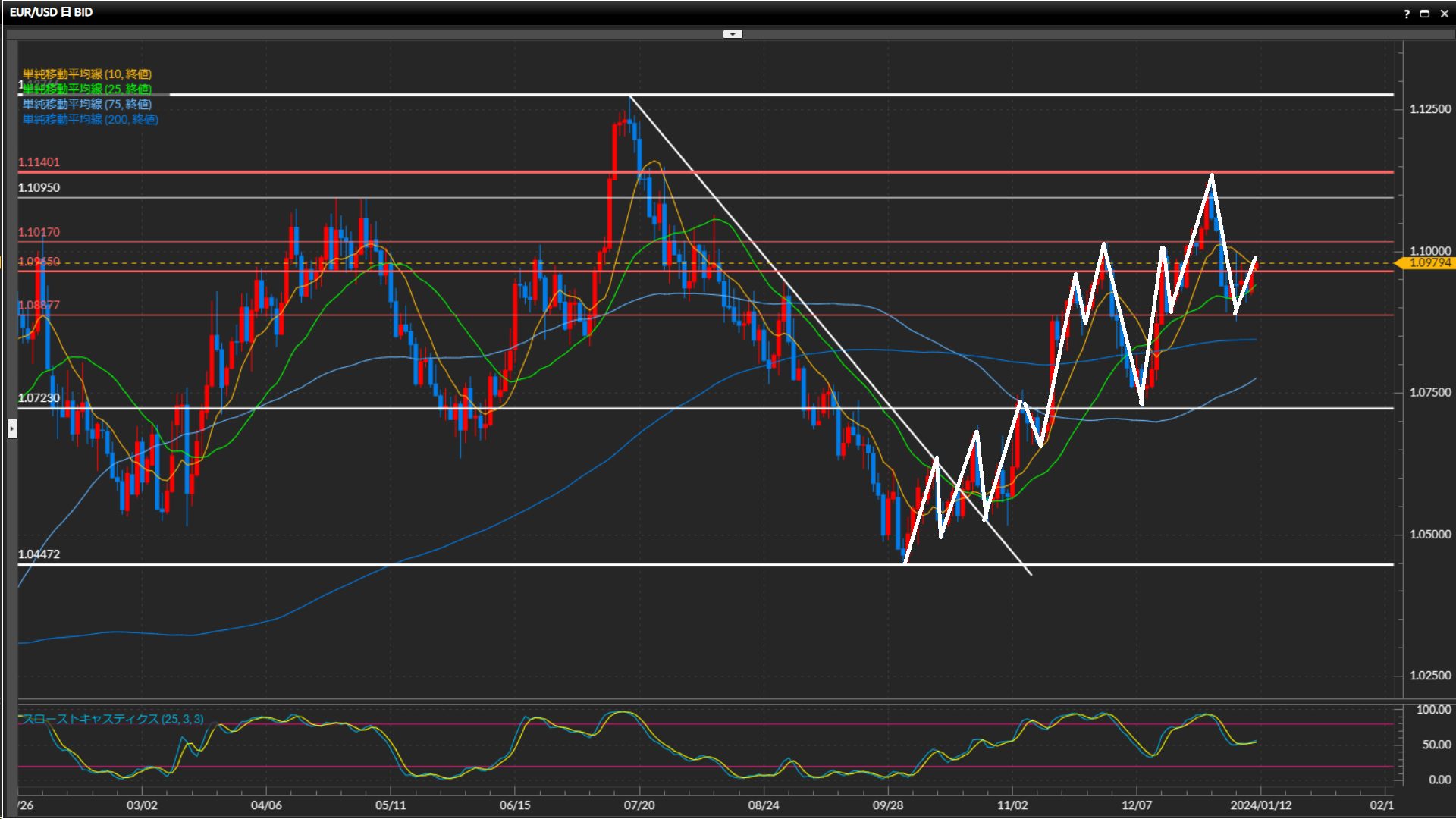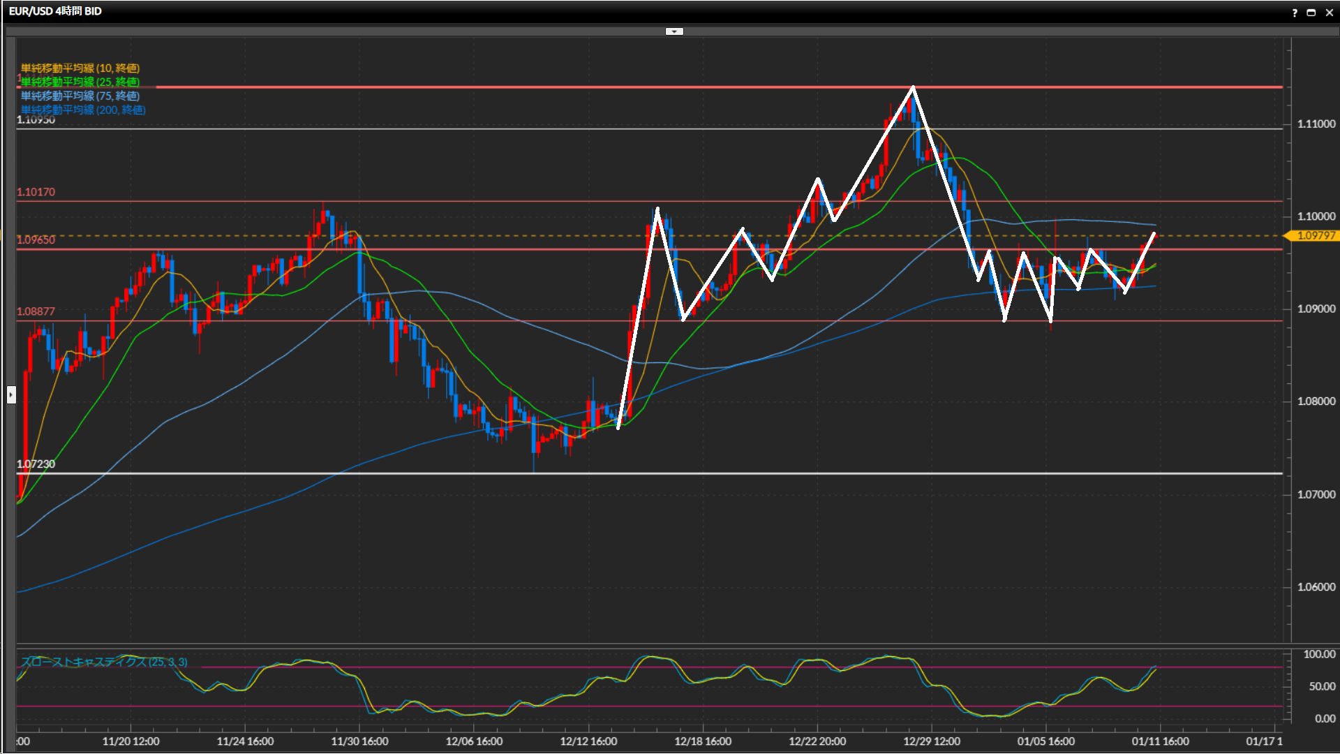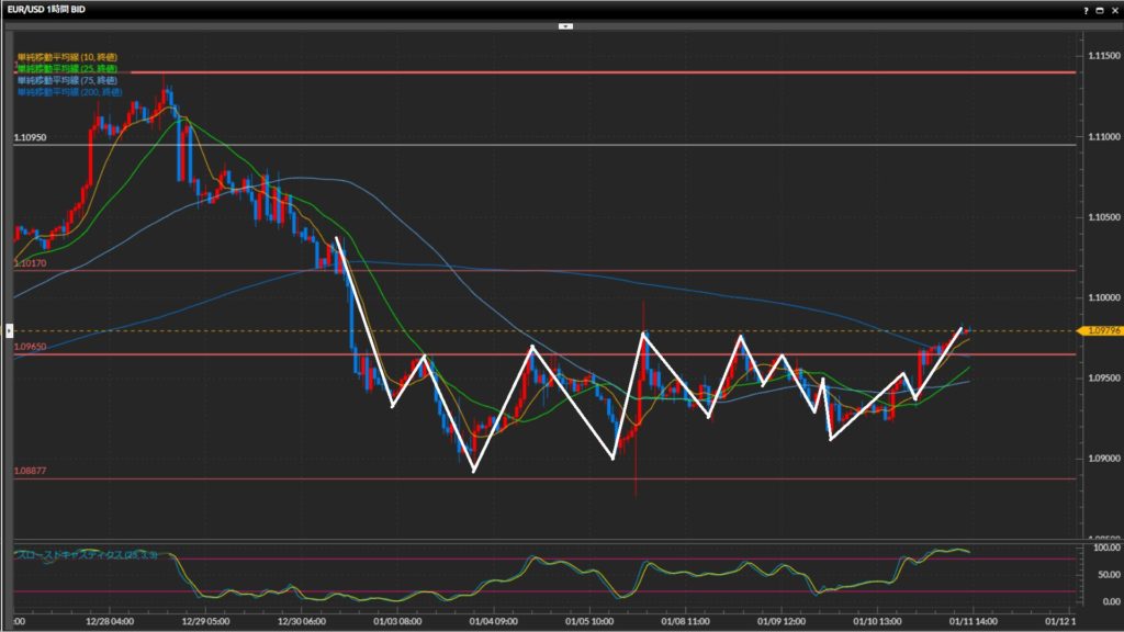 ひげ足の先1.0998ドルや4時間足の75SMA付近の動きに注目。