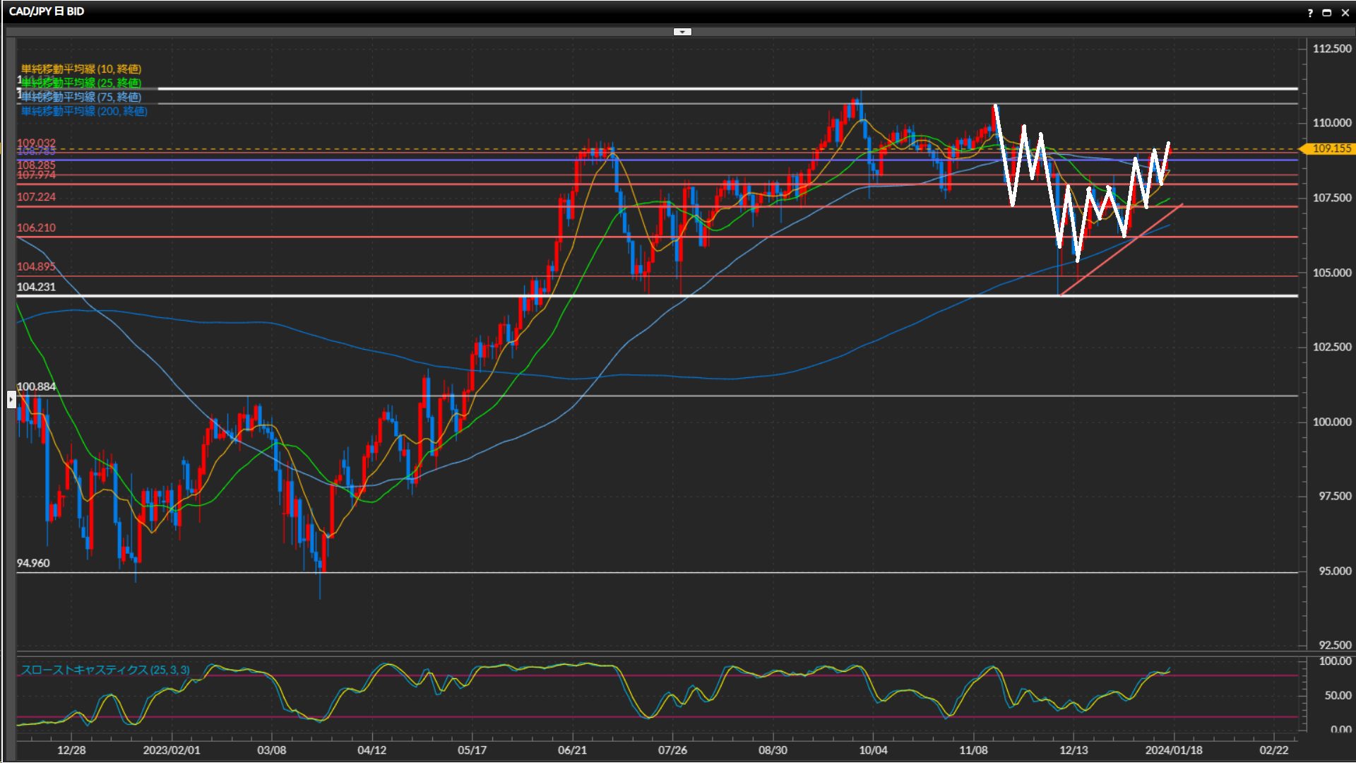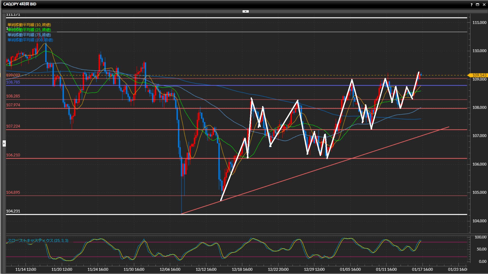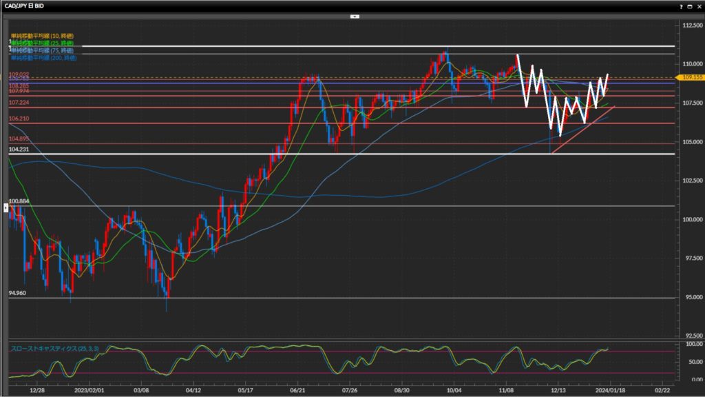 現在は先週にひげ足でつけた高値109.24円の突破チャレンジ中。