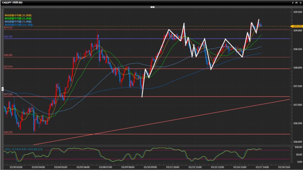 水平線108.79円を上抜けし、小さな波で高値安値を切上げ。