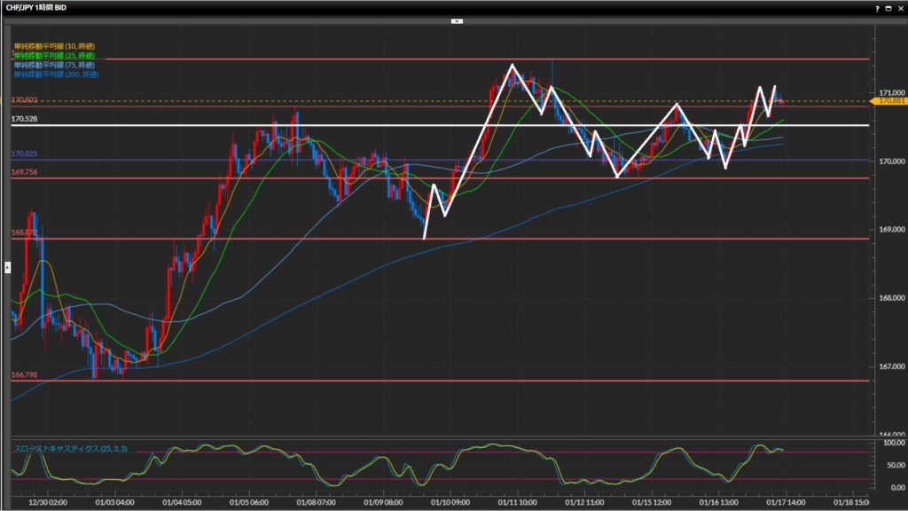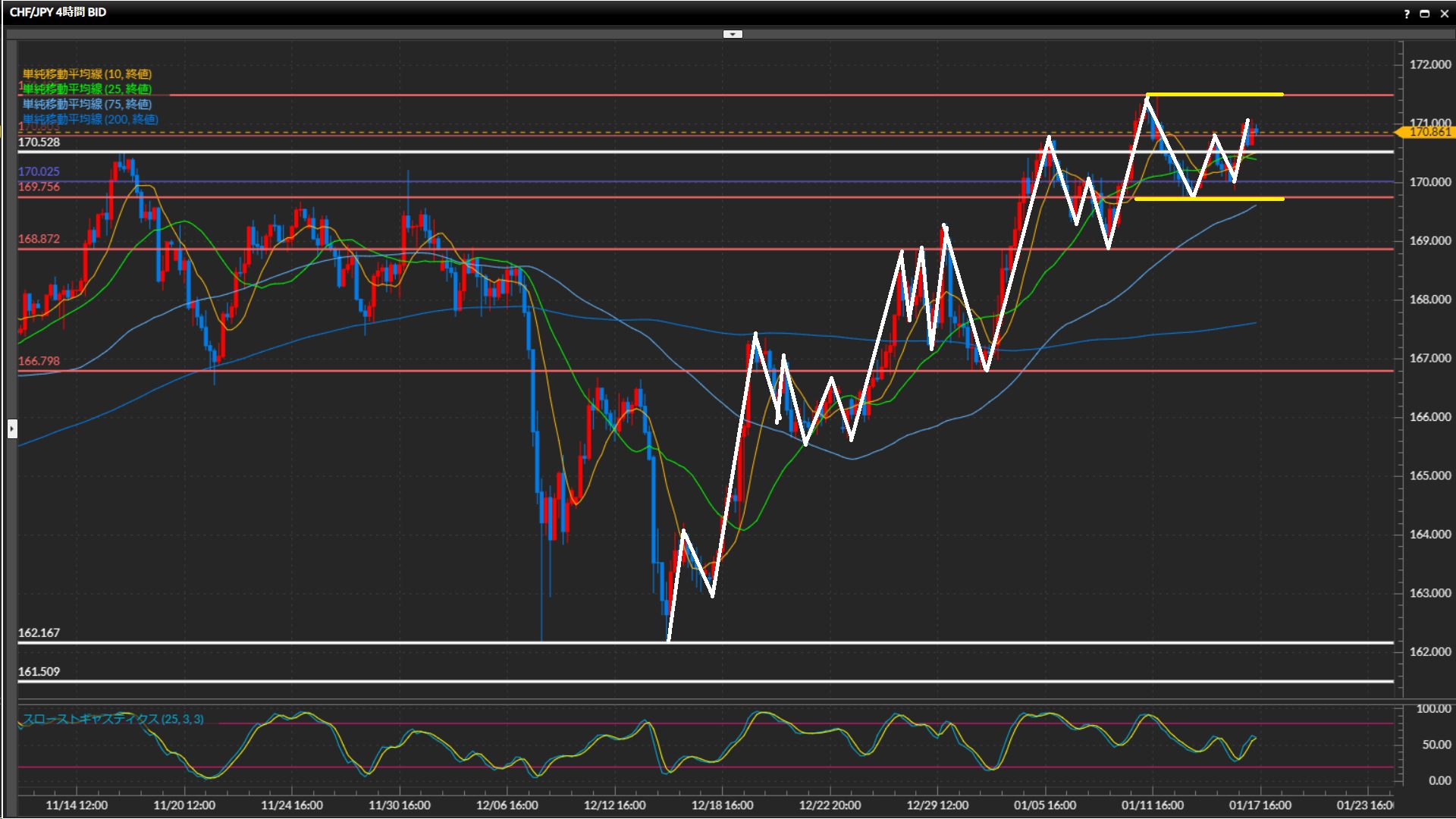 基本はロングだが、すでに高値圏に入っているため修正に注意。 - フラン円は日足は上目線、4時間足はレンジ、1時間足は上目線。