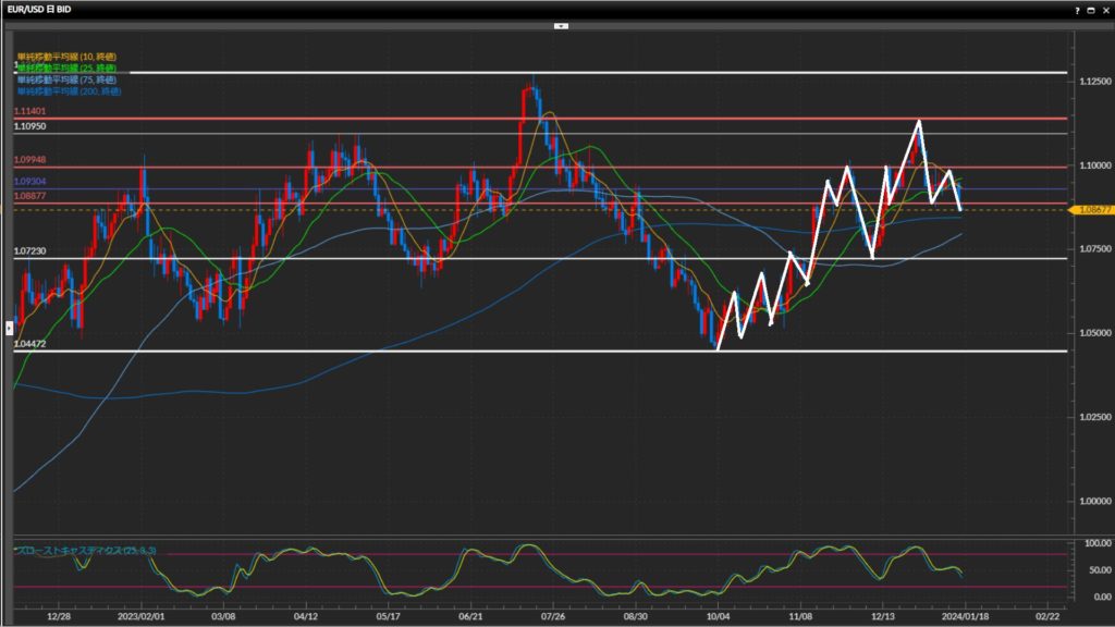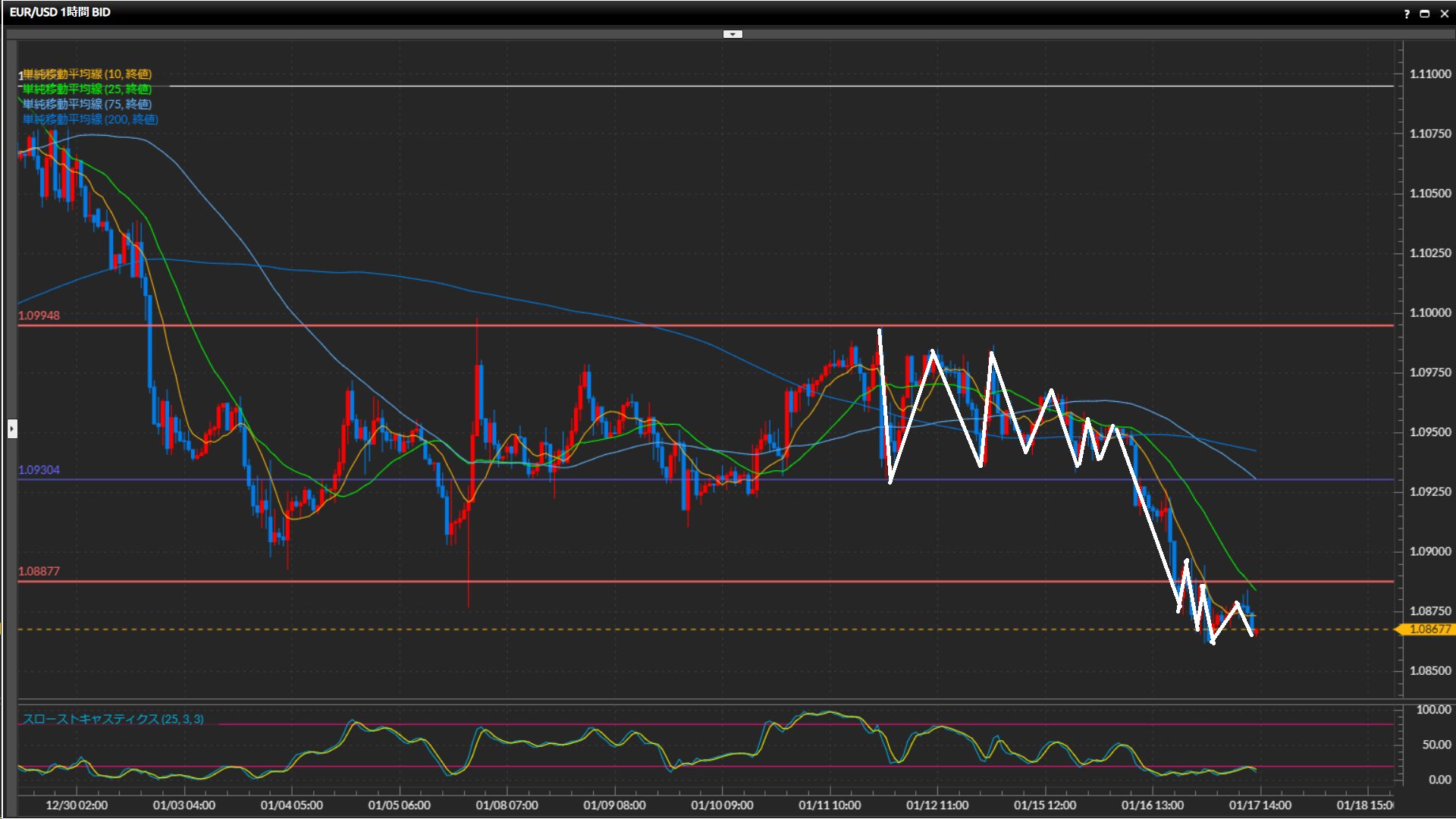 1.0995ドルで高値を切下げ、1.0888ドルを切下げたため下目線で固定。