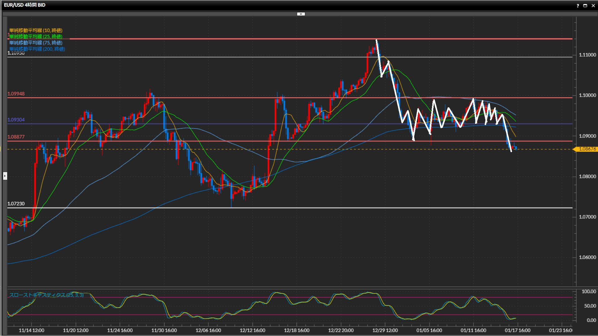 基本は戻り売り狙い。4時間足水平線1.0888ドルがレジスタンスラインとして機能して下落を強めるか注目。