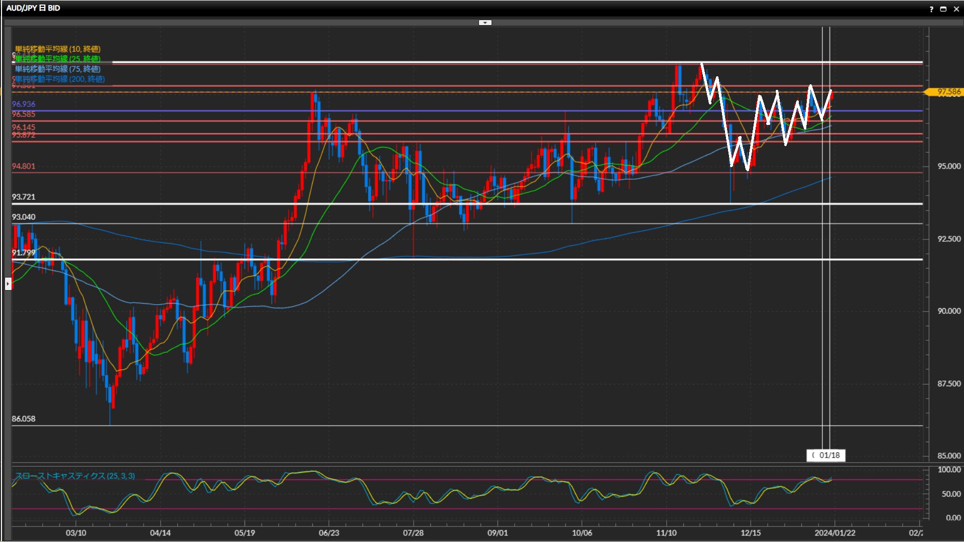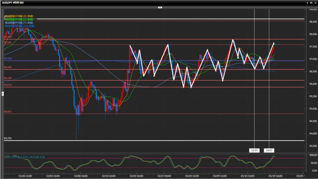 • 豪ドル円日足は上目線、4時間足は下目線終了、1時間足は上目線