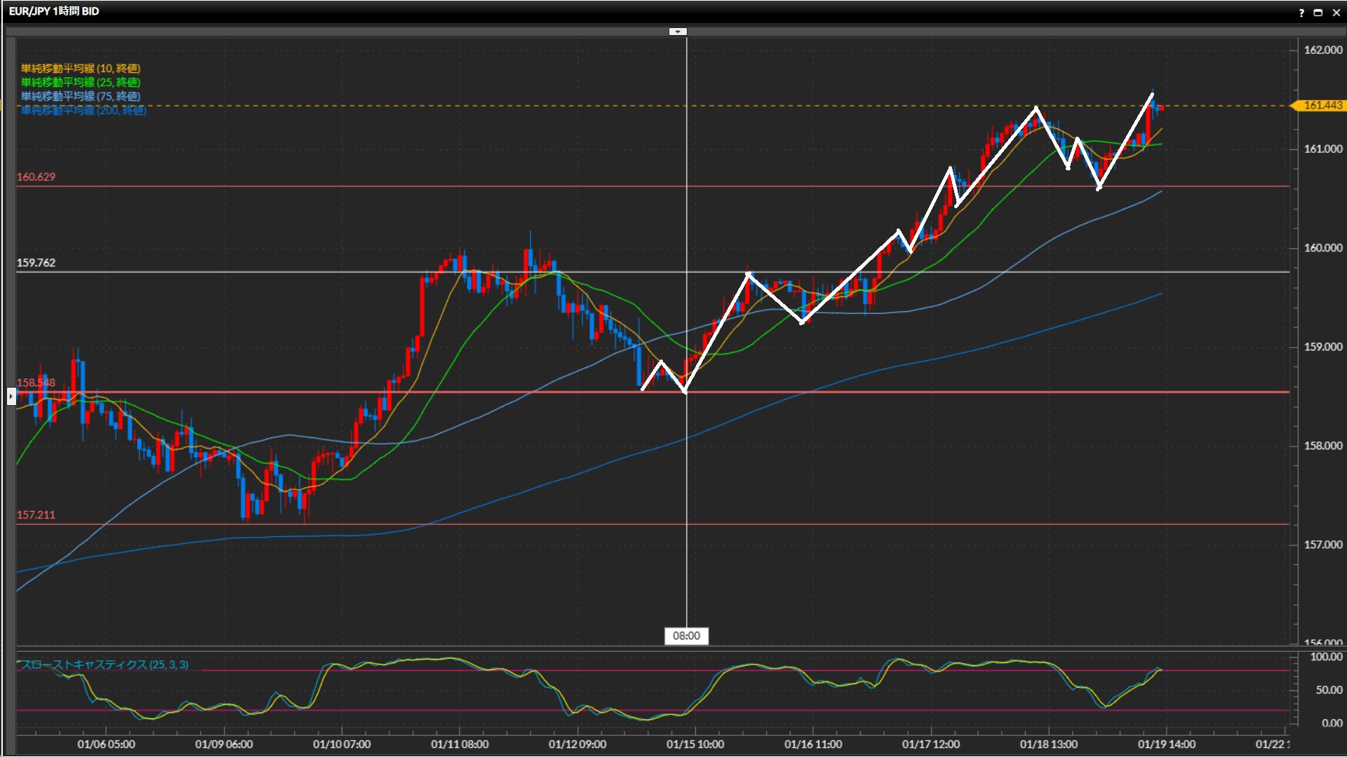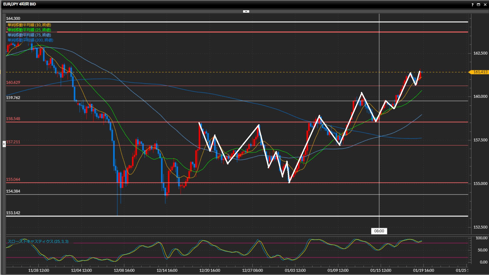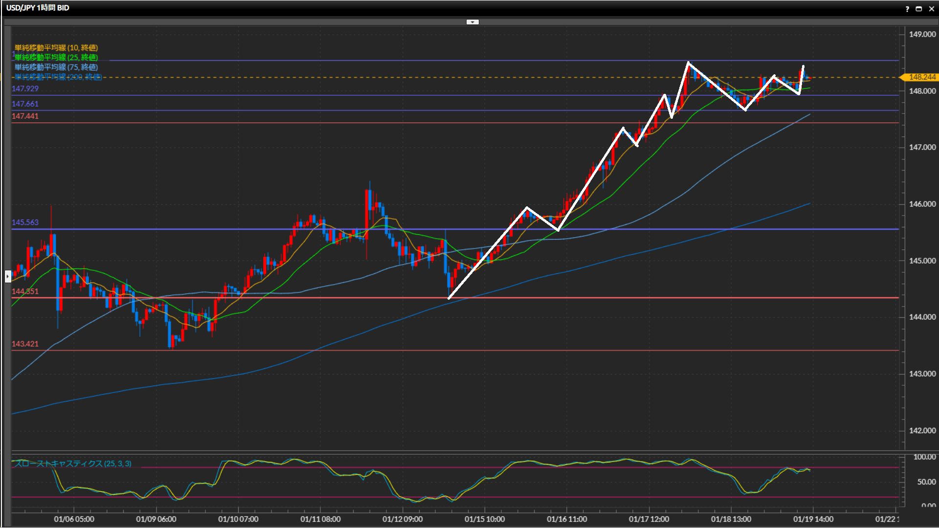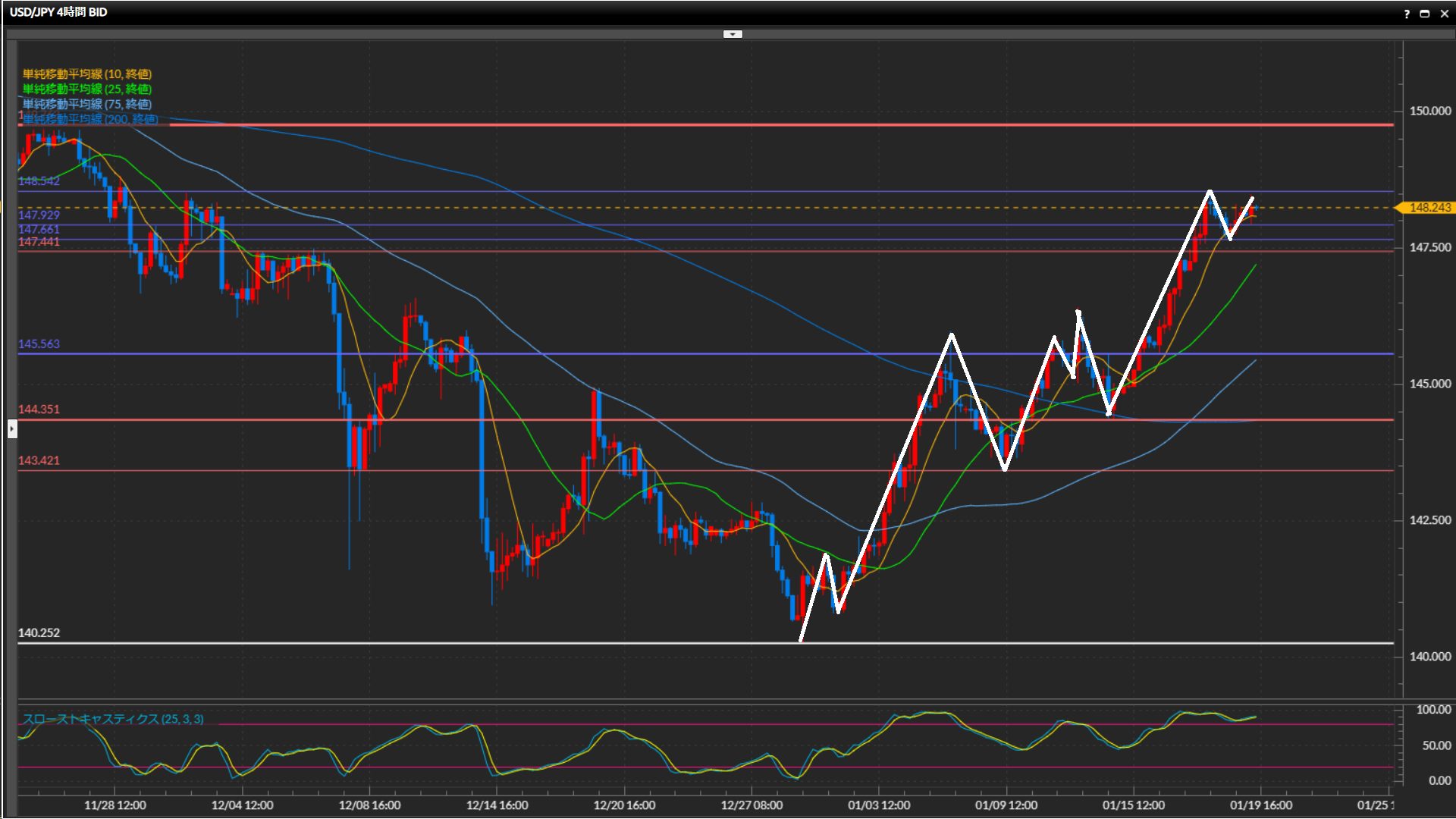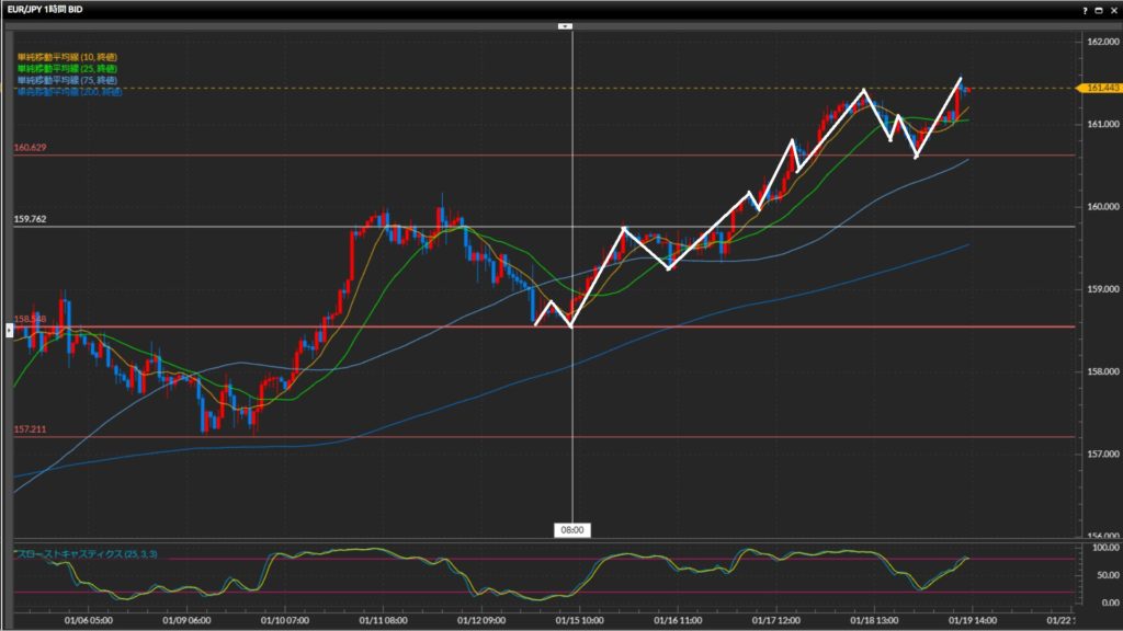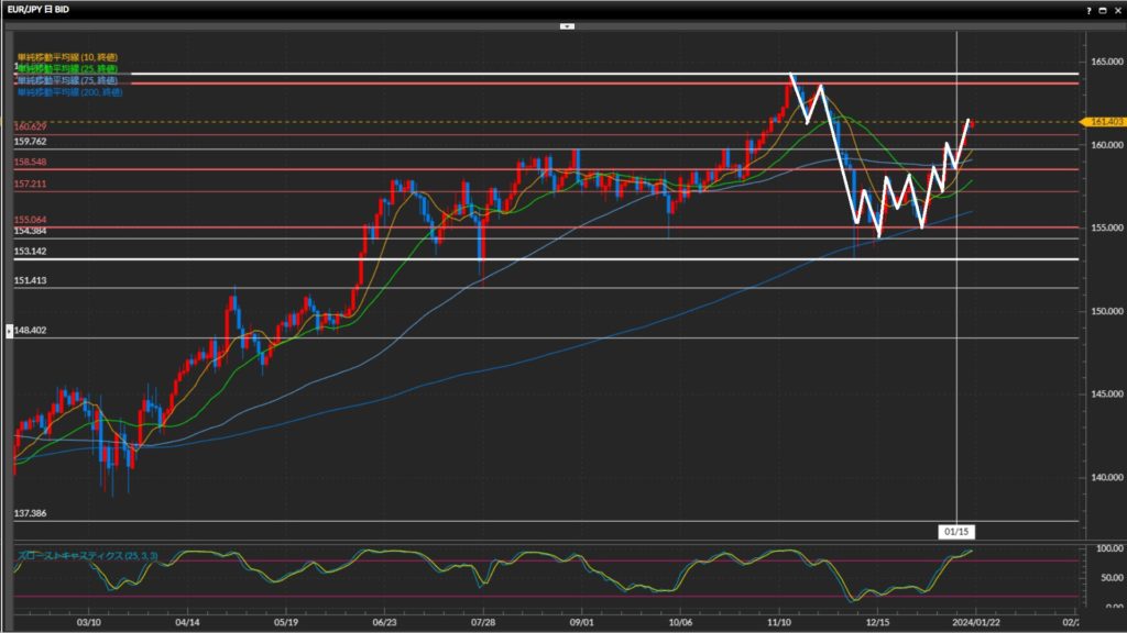 1月4日以降ストキャスが50%を下回っておらず、過熱感強め。