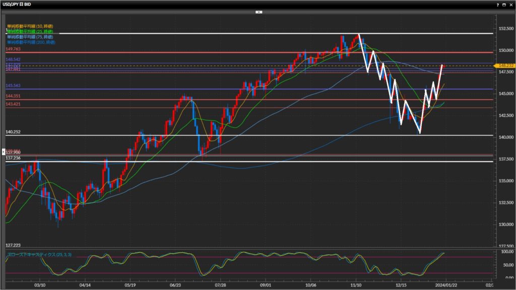 まずは一昨日の高値148.54円を抜けるかチェック。