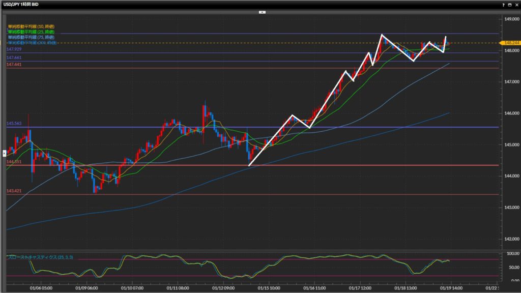 昨日147.66円で押し目を作り、そこから小さな波で高値安値切上げた形。