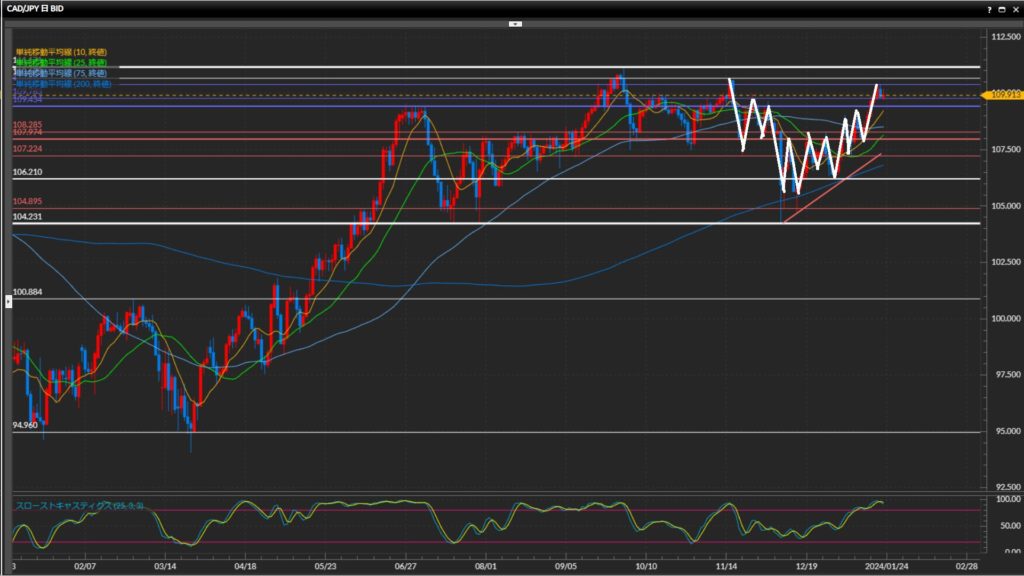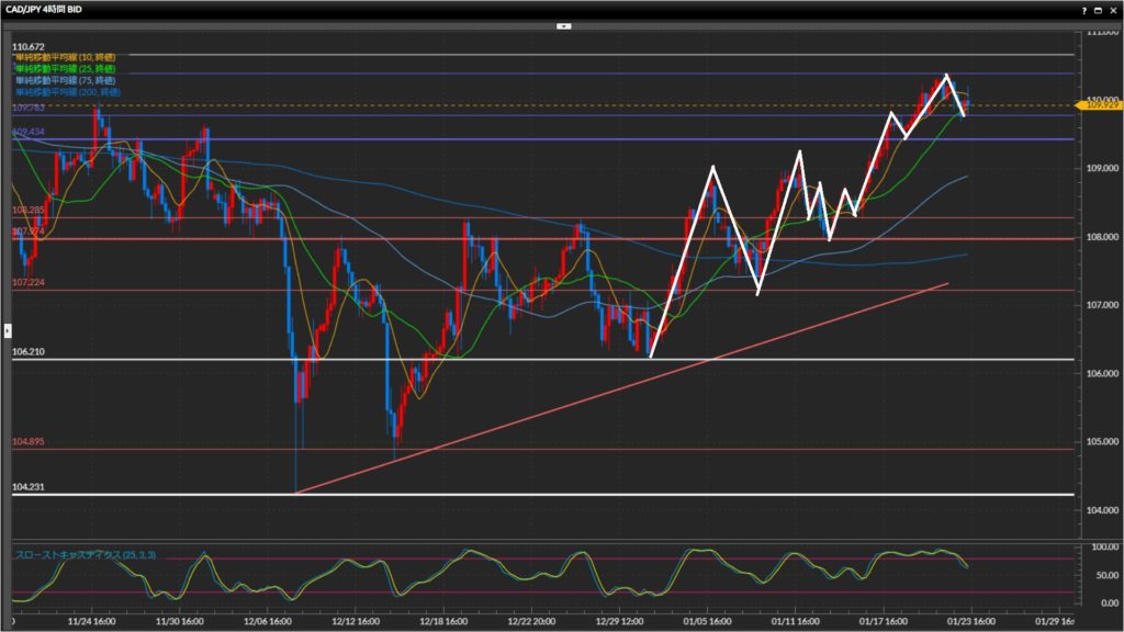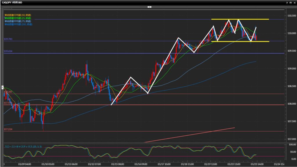 - 加ドル円は日足〜4時間足は上目線、1時間足はレンジ。