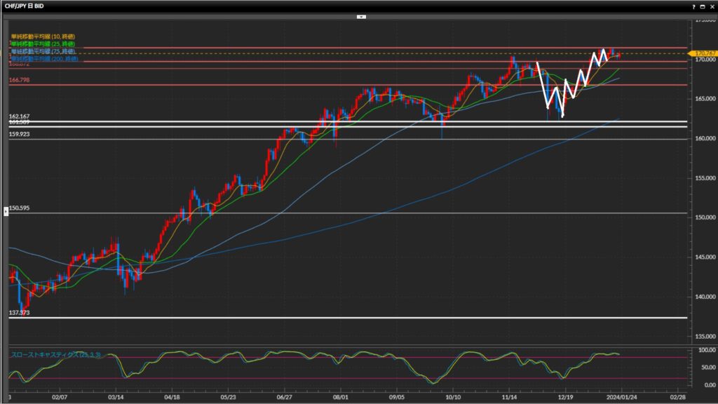 17日に最高値170.50円の更新チャレンジに失敗し、レンジ気味で上下中。