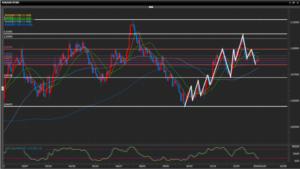 1.0995ドルで高値を切下げ、1.0888ドルを切下げたため下目線で固定。