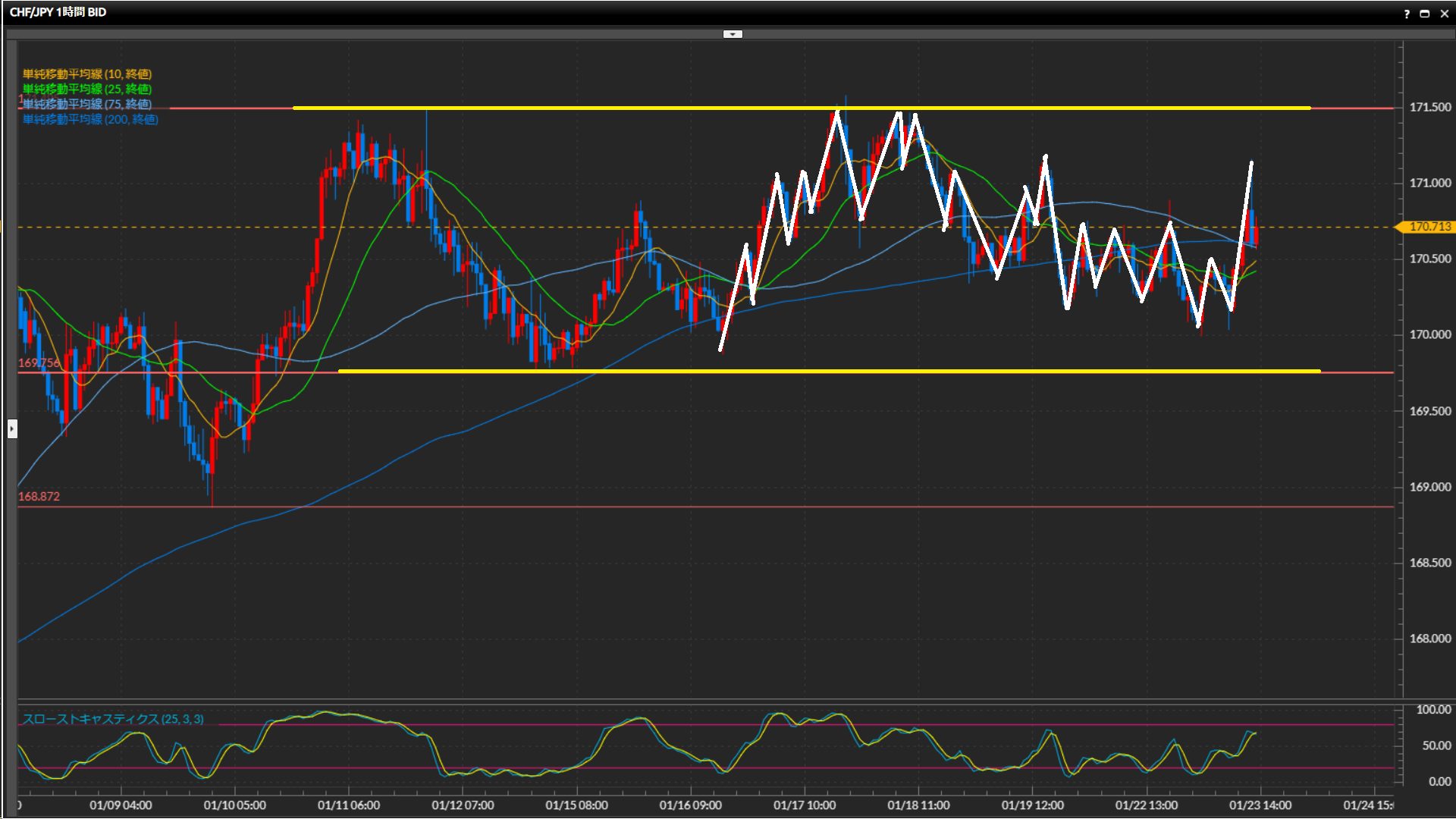 17日に最高値170.50円の更新チャレンジに失敗し、レンジ気味で上下中。