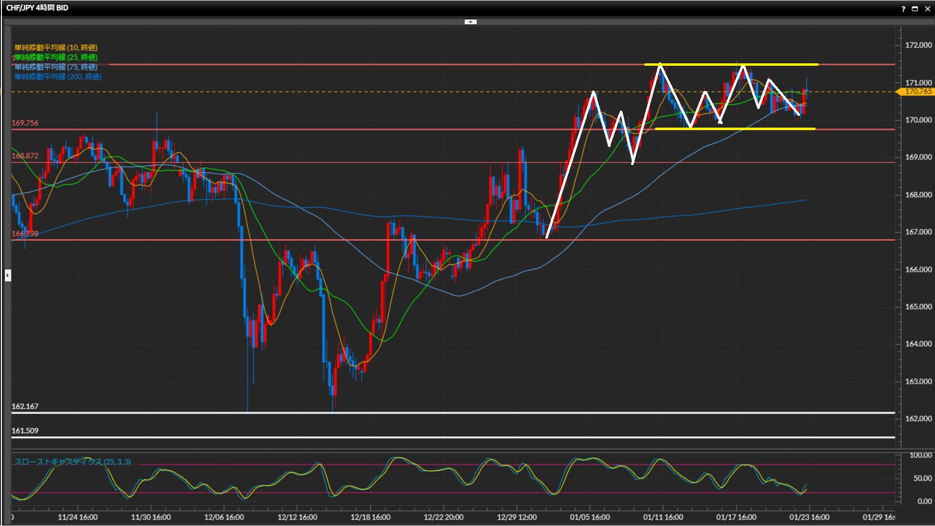 - 加ドル円は日足〜4時間足は上目線、1時間足はレンジ。