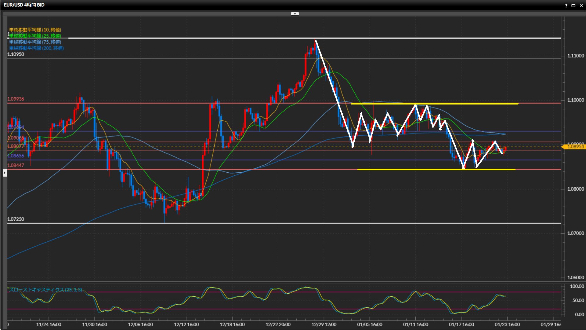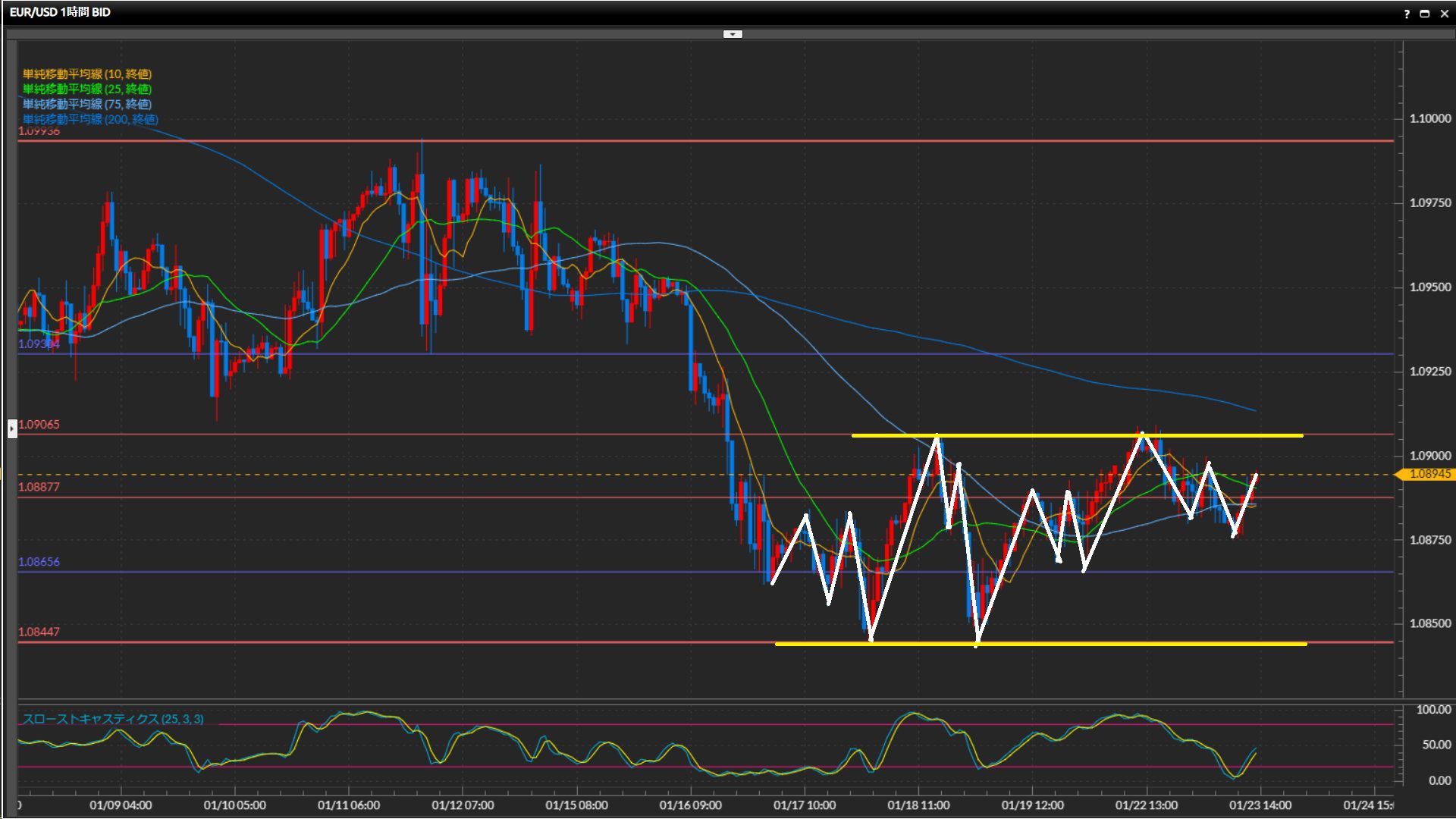 1.0995ドルで高値を切下げ、1.0888ドルを切下げたため下目線で固定。