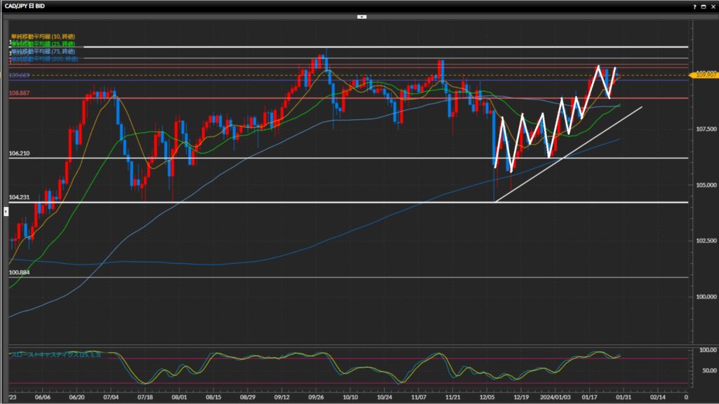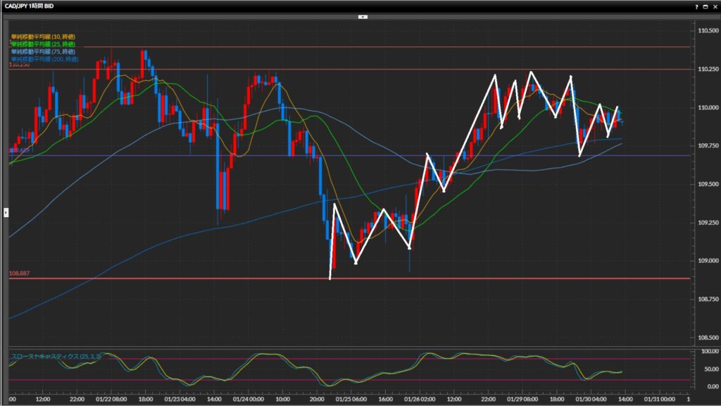 - 加ドル円は日足は上目線、4時間足は下目線、1時間足は上目線終了。