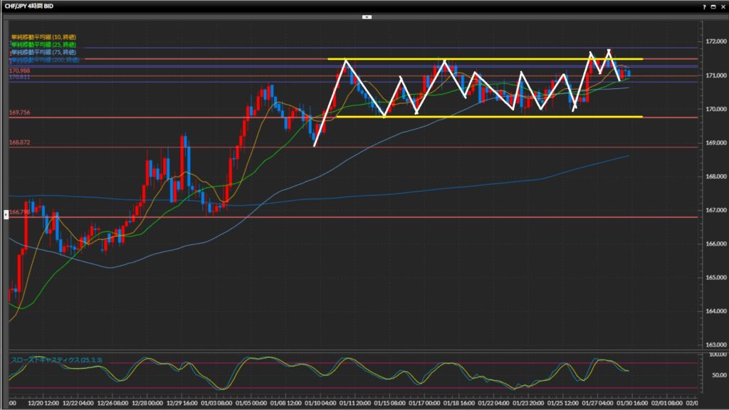 4時間足の169.76円-171.50円をレンジを意識しつつ、1時間足基準ではショート狙い。