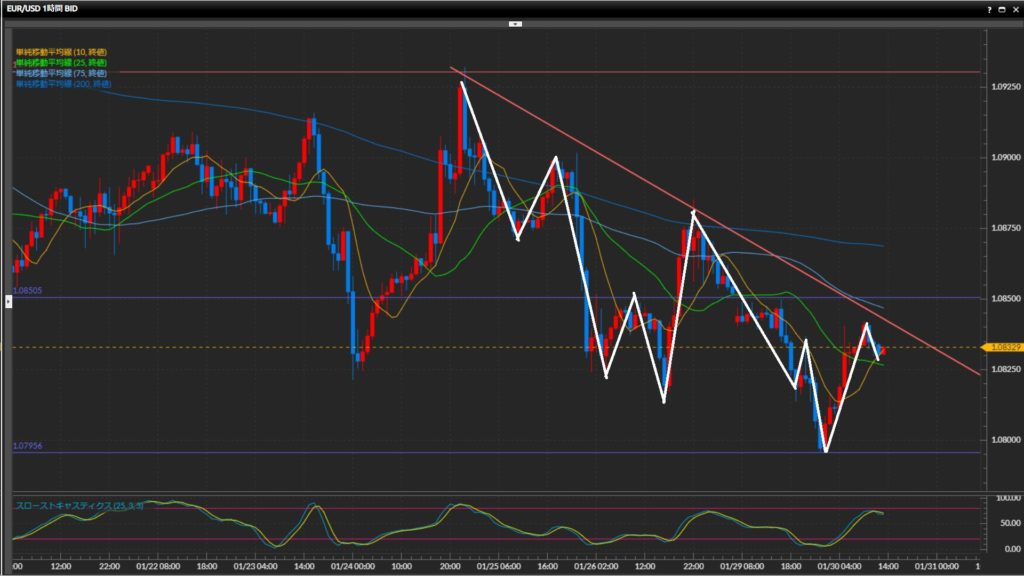 小さな波では高値切上げになっているものの、大きな流れが分かりやすく下降トレンドのため、基本的にはショートでエントリーポイントを探りたい。