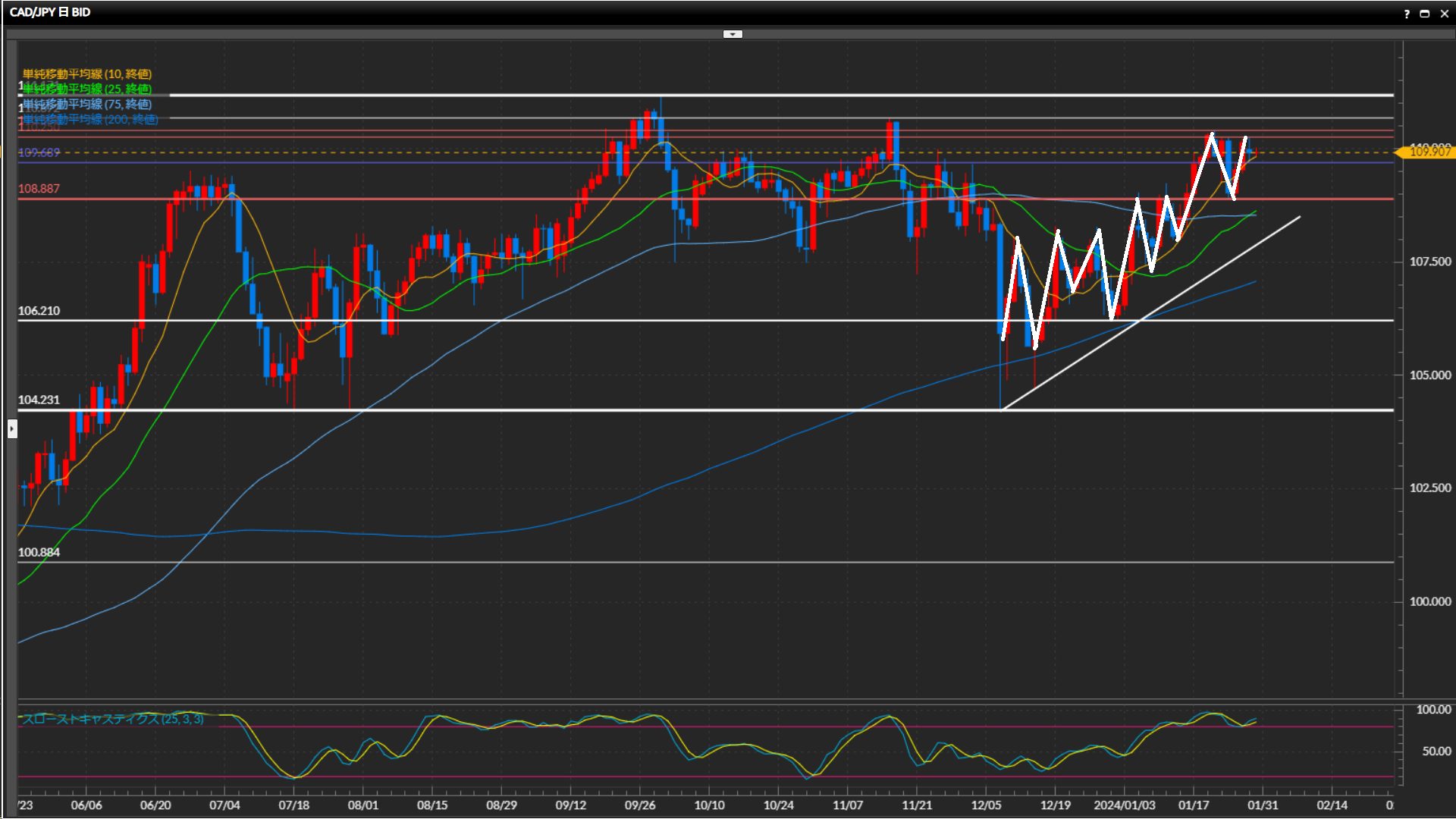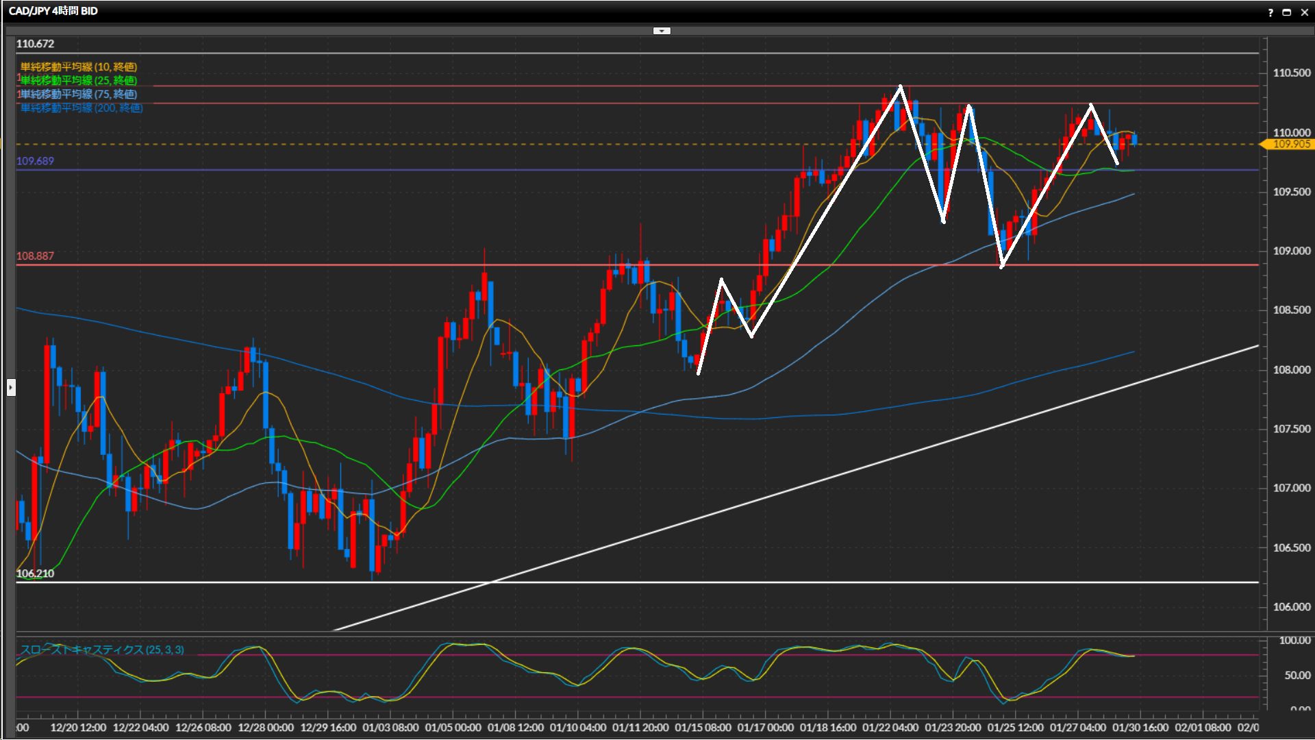 - 加ドル円は日足は上目線、4時間足は下目線、1時間足は上目線終了。