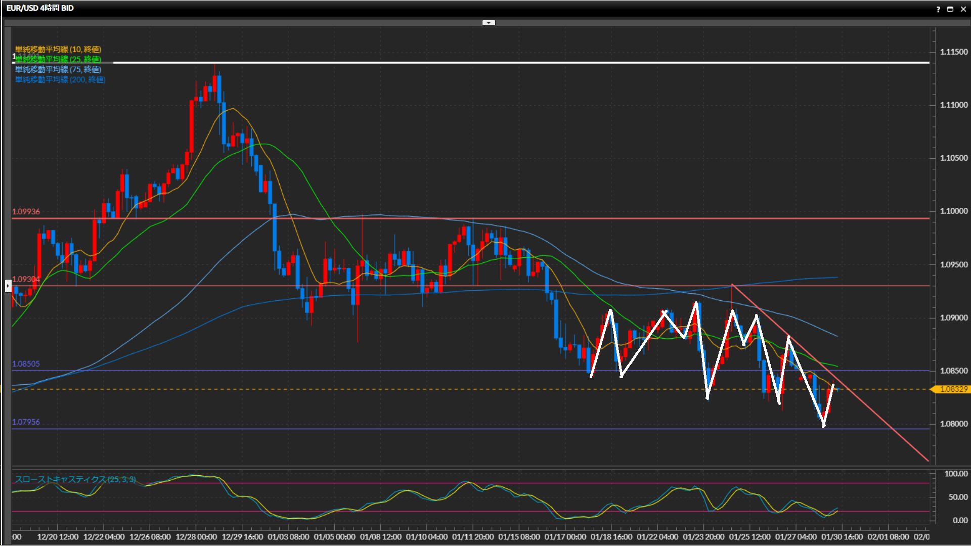 早朝から急な上下が入っており、月末フローに注意したい。 - ユーロドルは日足〜4時間足は下目線、1時間足は下目線終了。