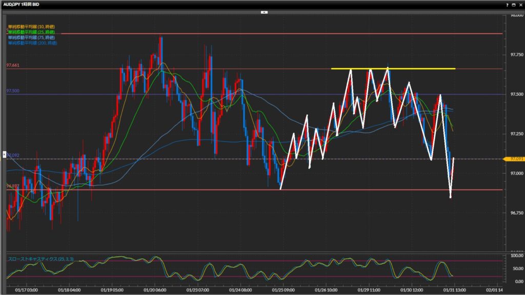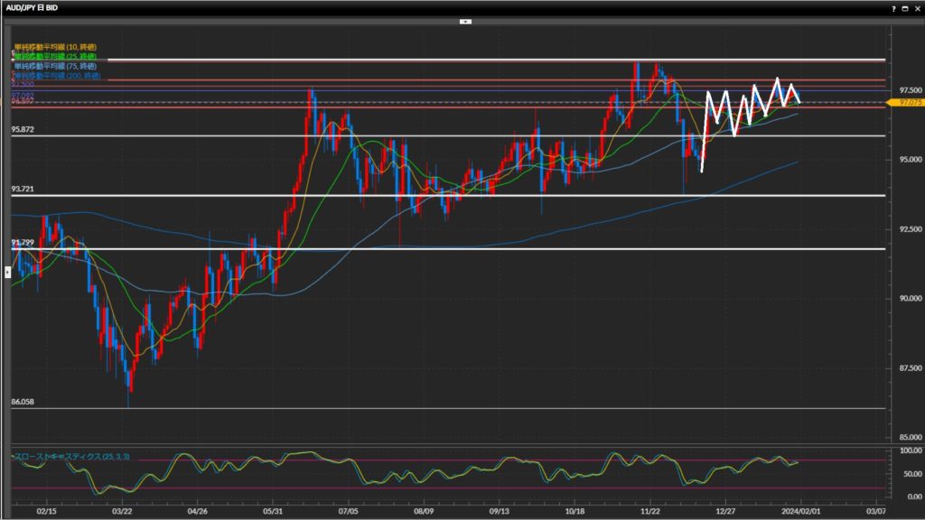 • 豪ドル円は日足は上目線終了、4時間足〜1時間足は下目線