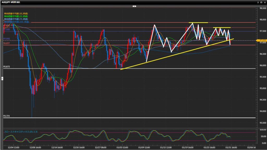 日足の25SMAや4時間足水平線96.90円に支えられる可能性も考慮したい。