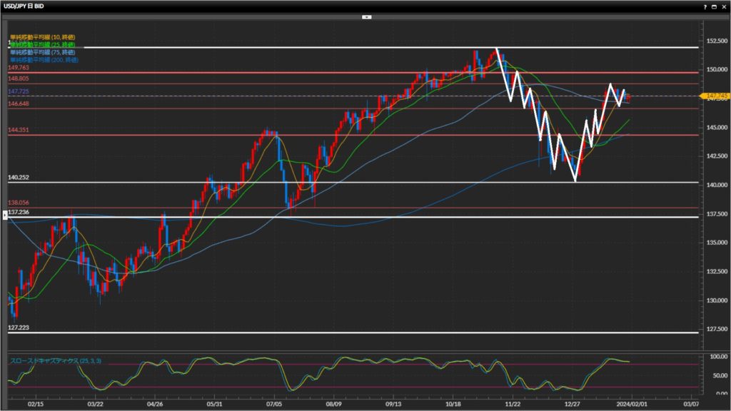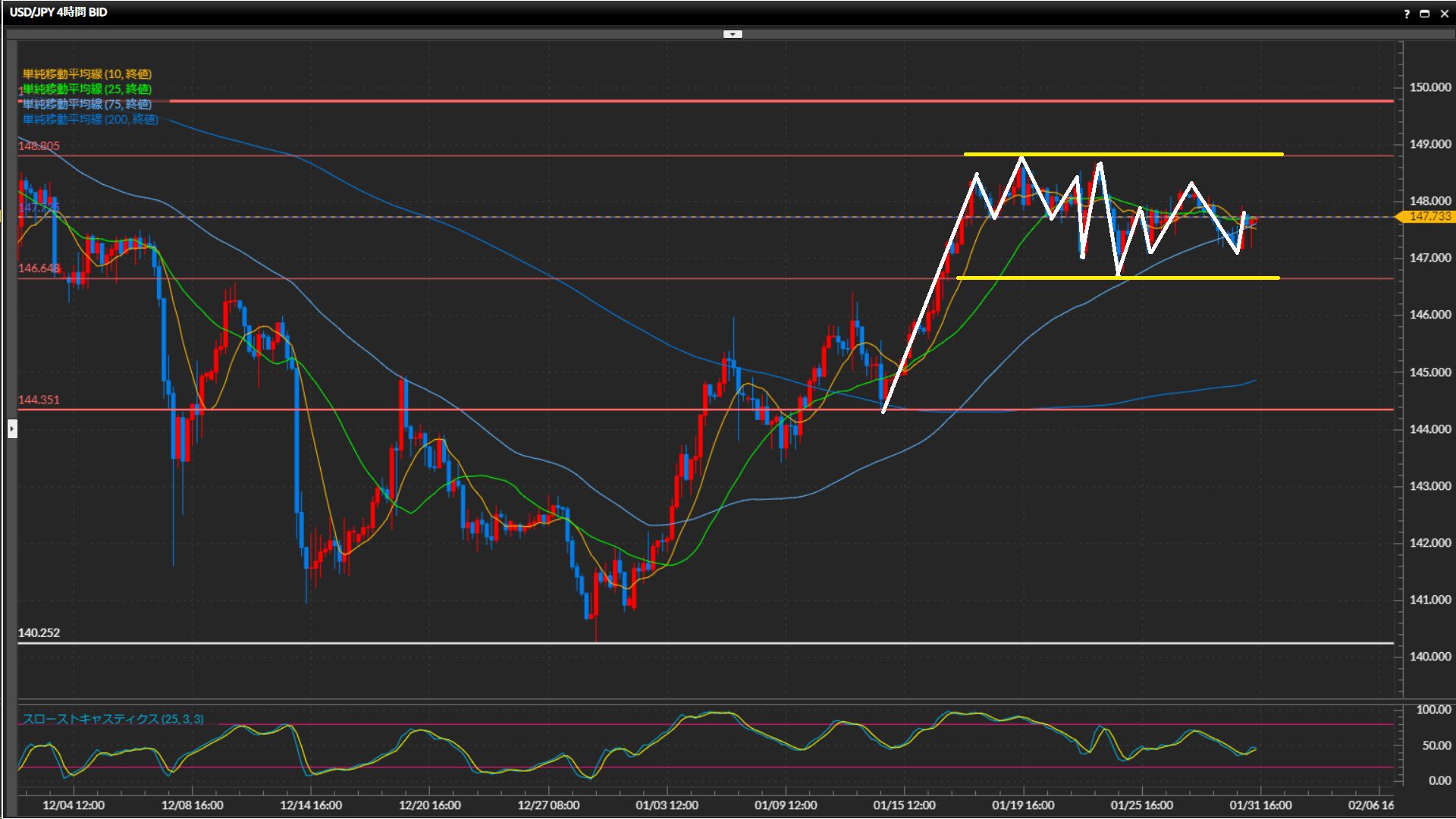 146.65円-148.81円のレンジ内で揉み合いが継続。