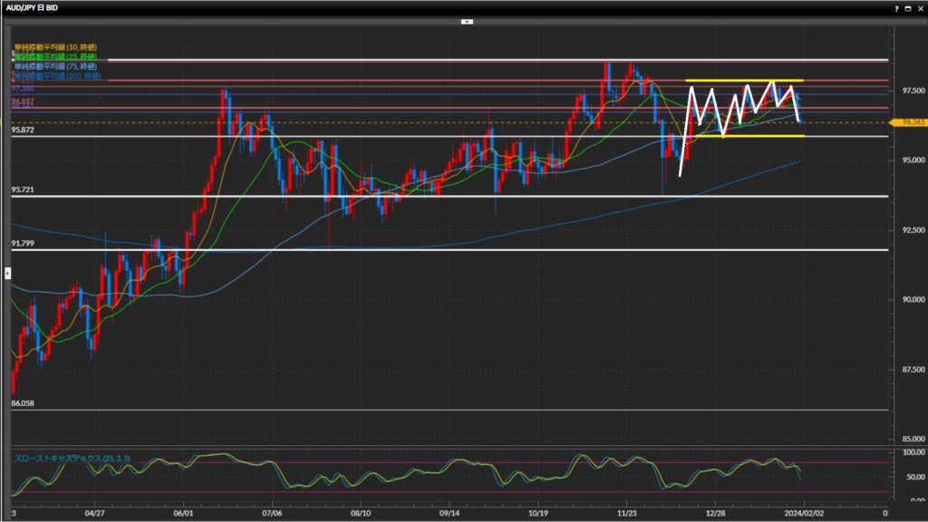 12月後半からの動きがレンジ気味のため、下値として意識されそうな95.87円に注意。