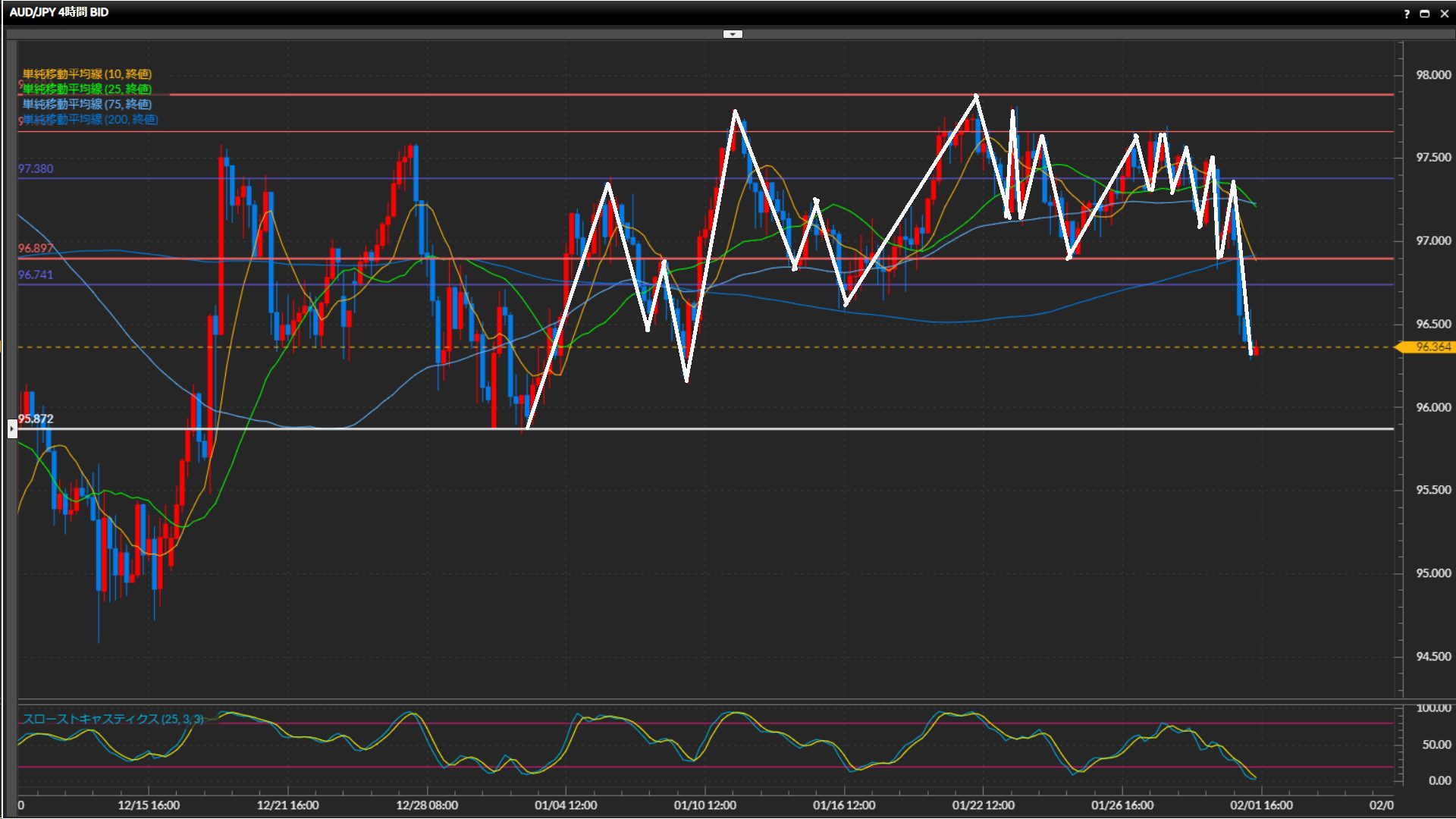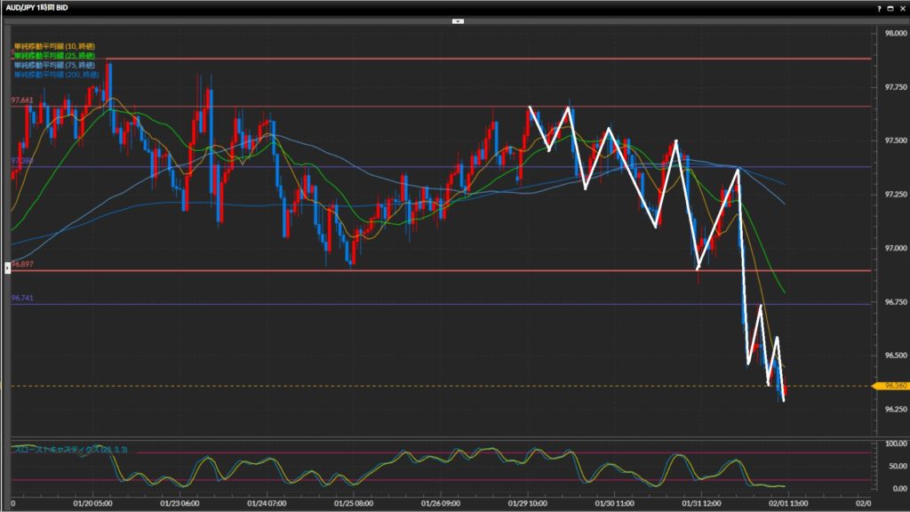 戻り目を作ったらショートで仕掛けたいものの、今の下落で日足水平線95.87円まで到達してしまったら様子見。
