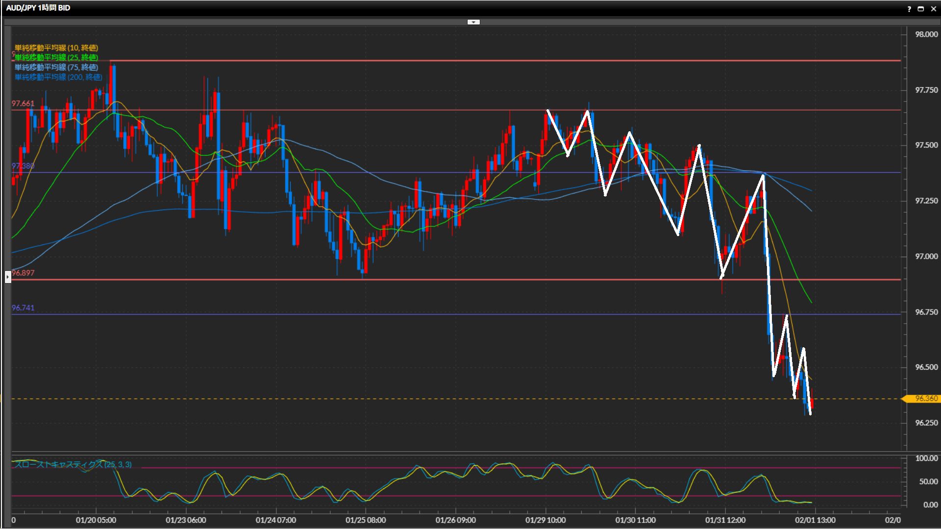 意識されていた25SMA、75SMAを一気に下抜け。