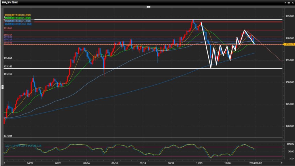 高値安値切下げが継続。水平線158.55円の下抜けをチャレンジ中。