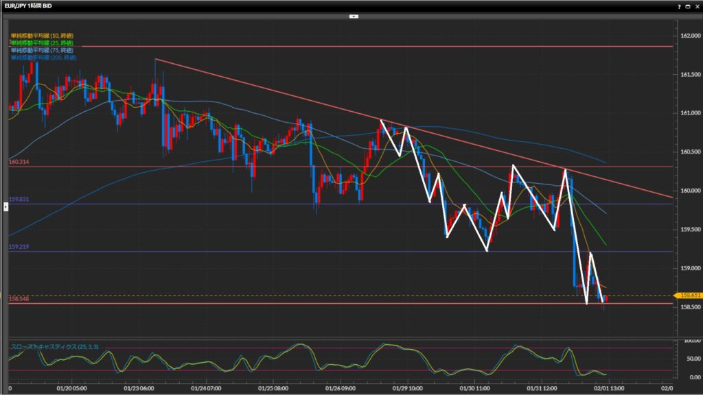 1時間足25SMA、75SMA付近から仕掛けを検討し、上抜けしたら手仕舞い。 - ユーロ円は日足は上目線、4時間足〜1時間足は下目線。