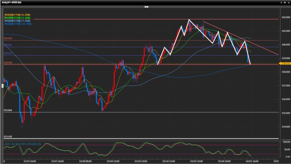 現時点では4時間足水平線158.55円をひげ足では抜けているものの、実体ではサポート。
