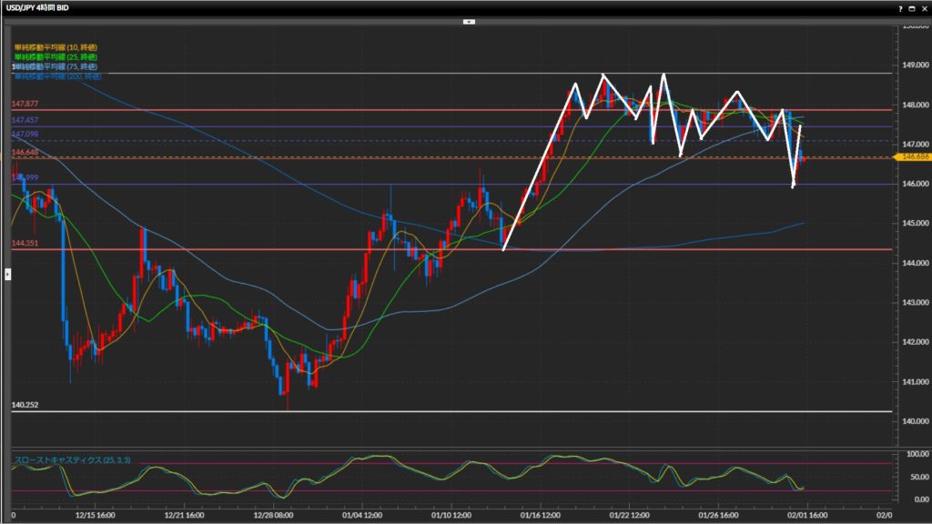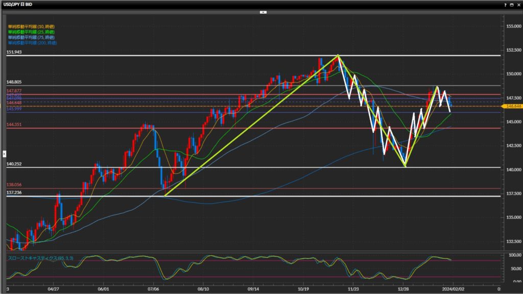 ひげ足の先でつけた147.46円を直近高値として基本はショート狙い。