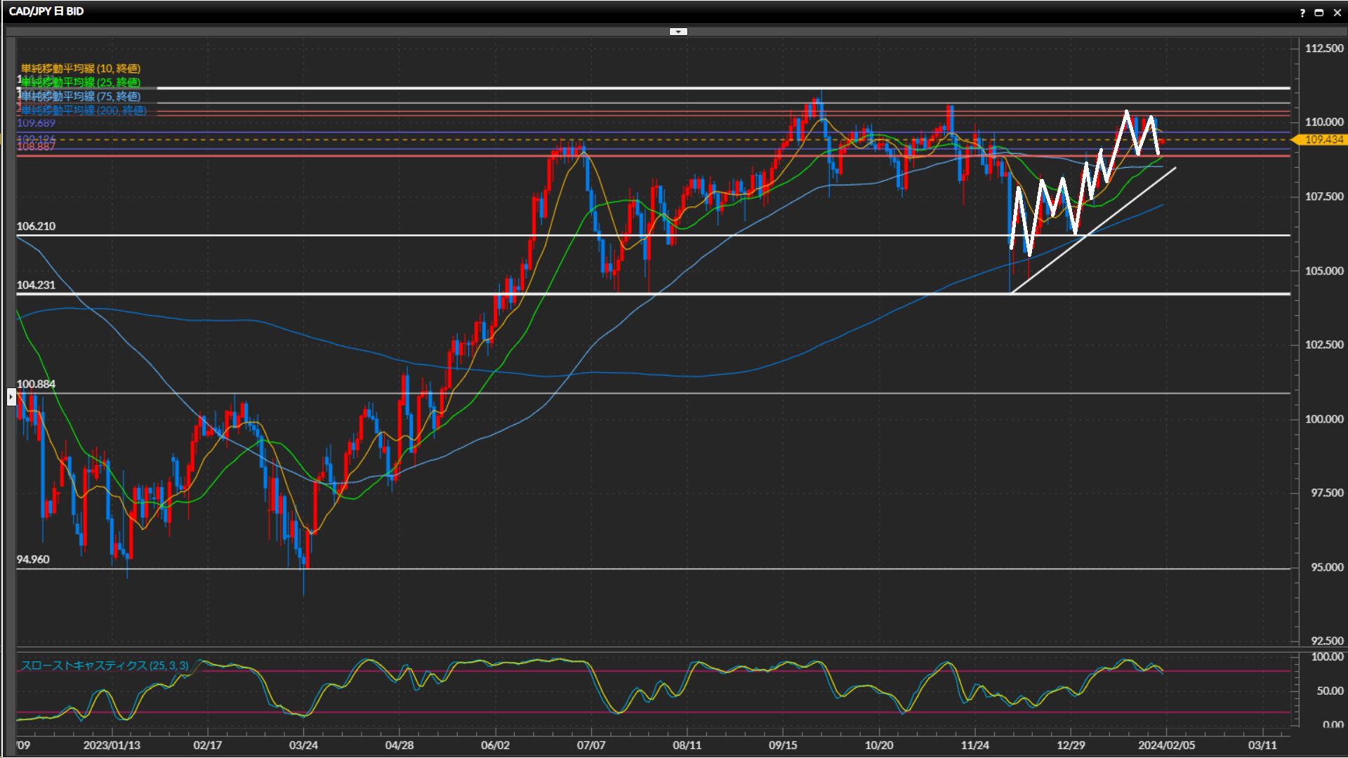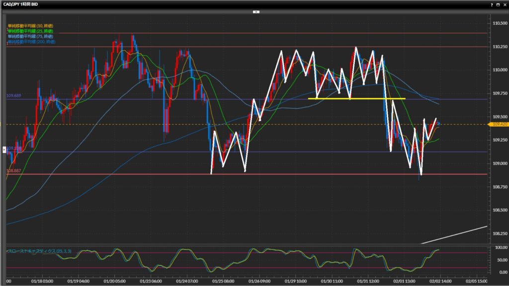 無理に仕掛けて負けても資金が勿体ないため、基本は様子見。 - 加ドル円は日足は上目線終了、4時間足はレンジ、1時間足は上目線。