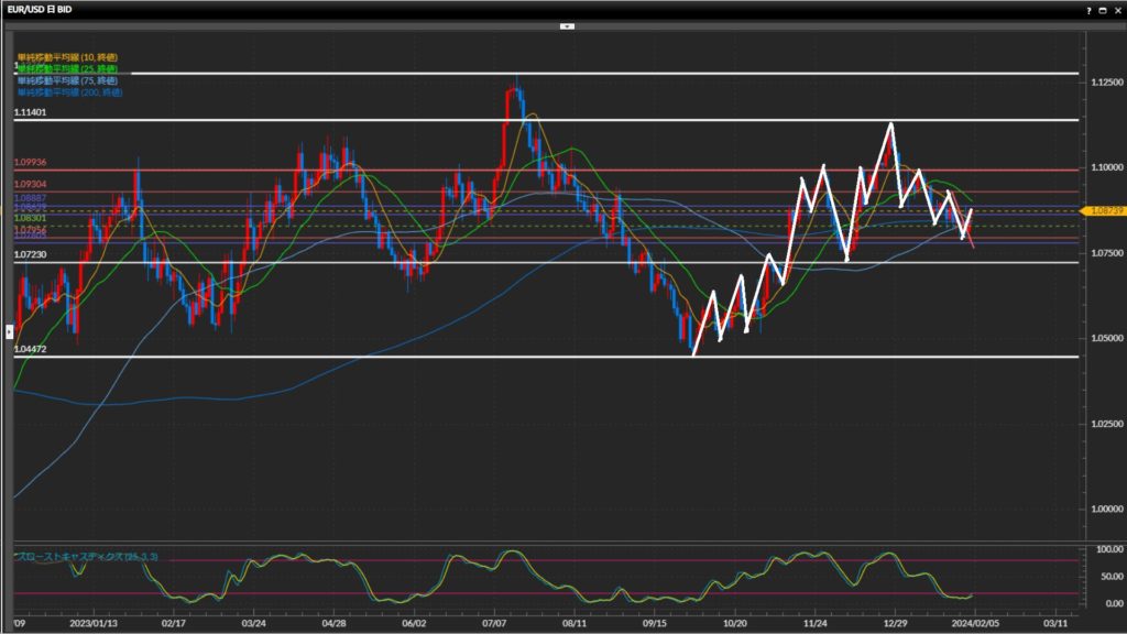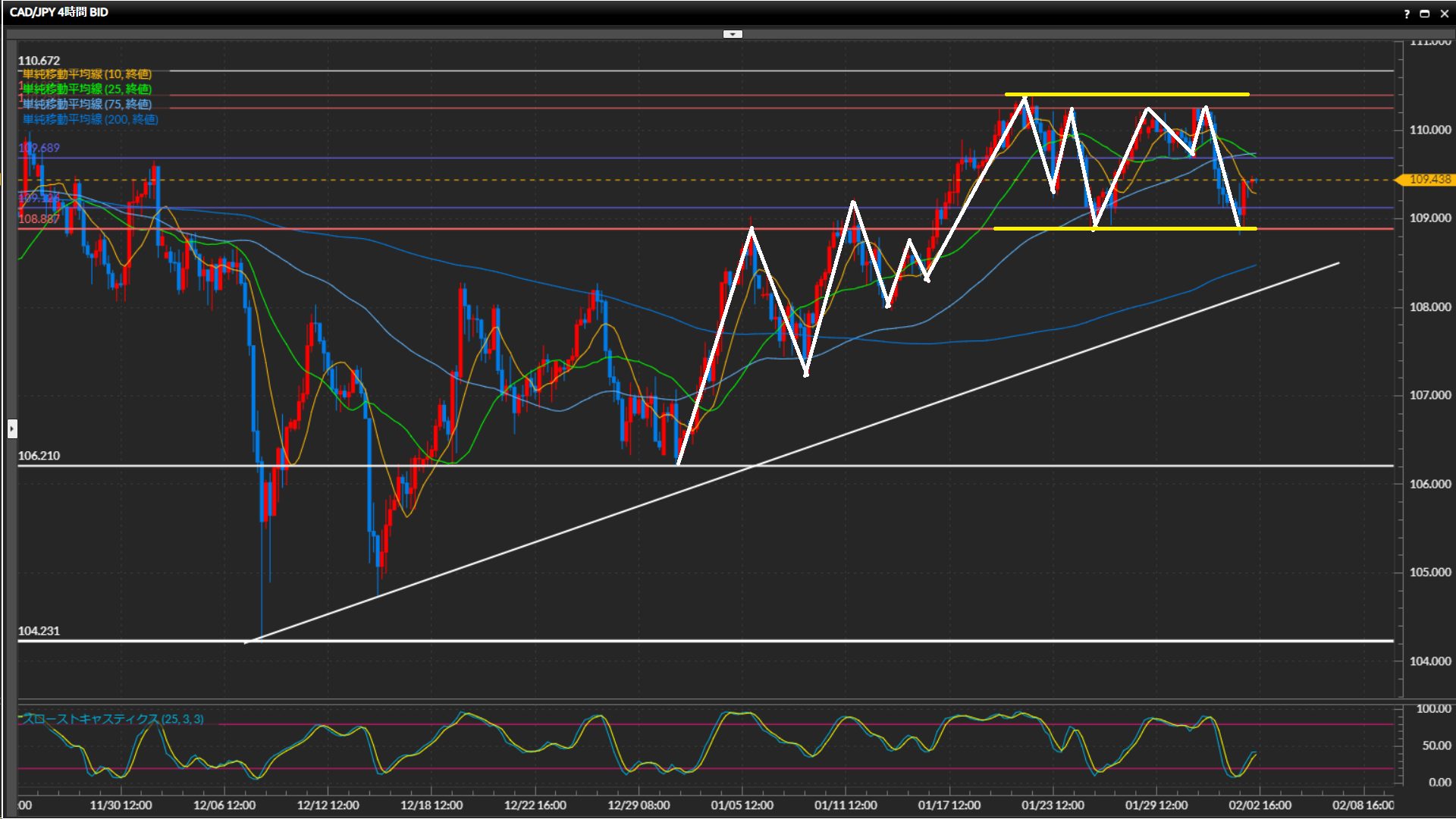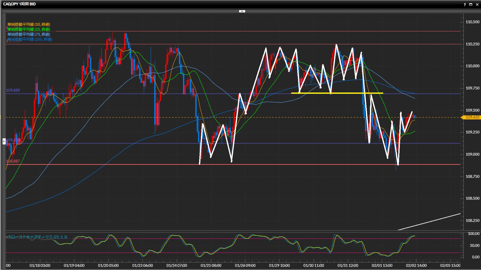 波の高安で方向感を判断できないため、一旦108.89円-110.40円のレンジで捉える。