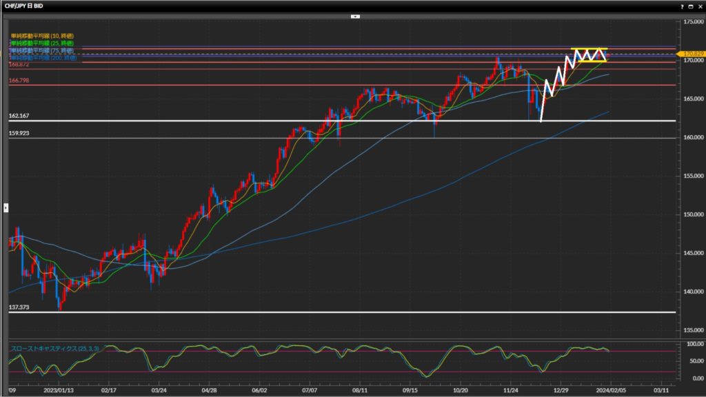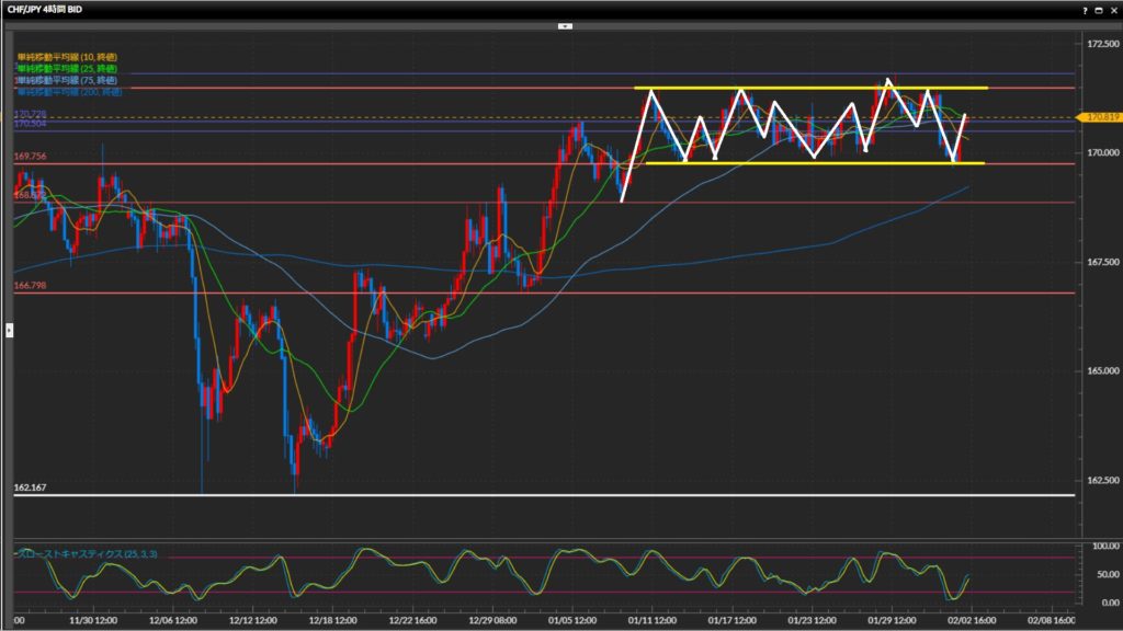4時間足以上で方向感がはっきりしていないため、基本は様子見。 - フラン円は日足〜1時間足でレンジ。