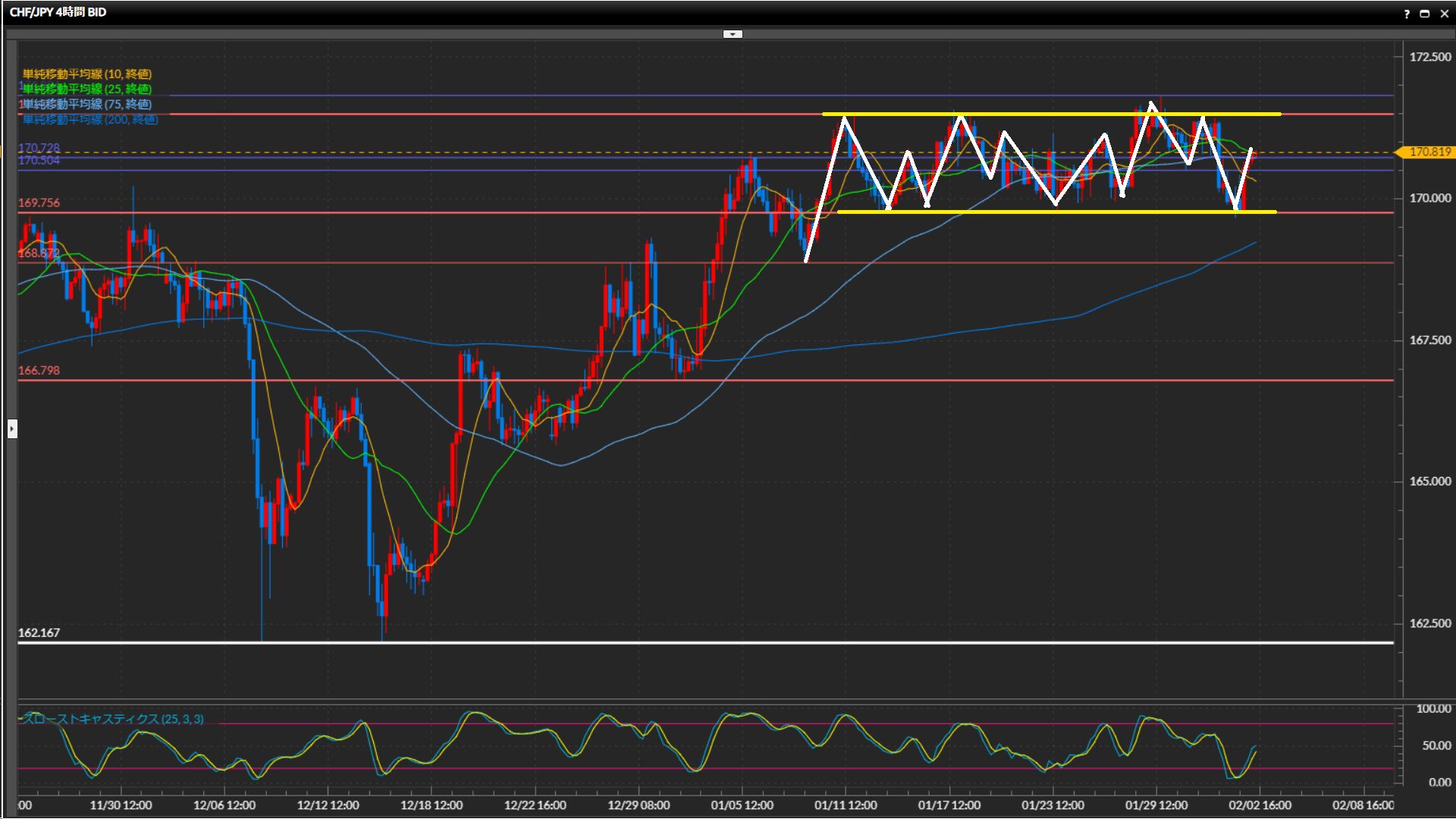 レンジ高値の171.50円を抜けているものの、その後レンジ内に戻っている事から揉み合いが継続中と捉える。