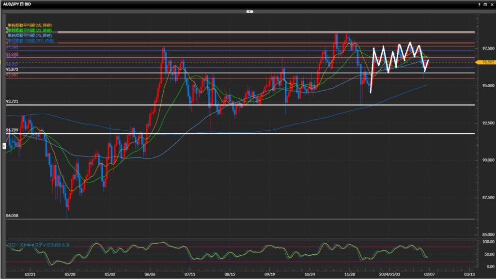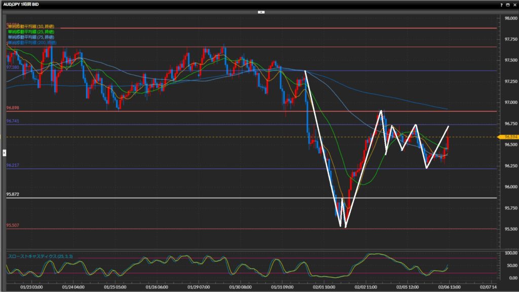 足元動意が薄いため様子見しつつ、下落をメインシナリオとしてショート狙い。 - 豪ドル円は日足は下目線、4時間足は下目線終了、1時間足は上目線終了。