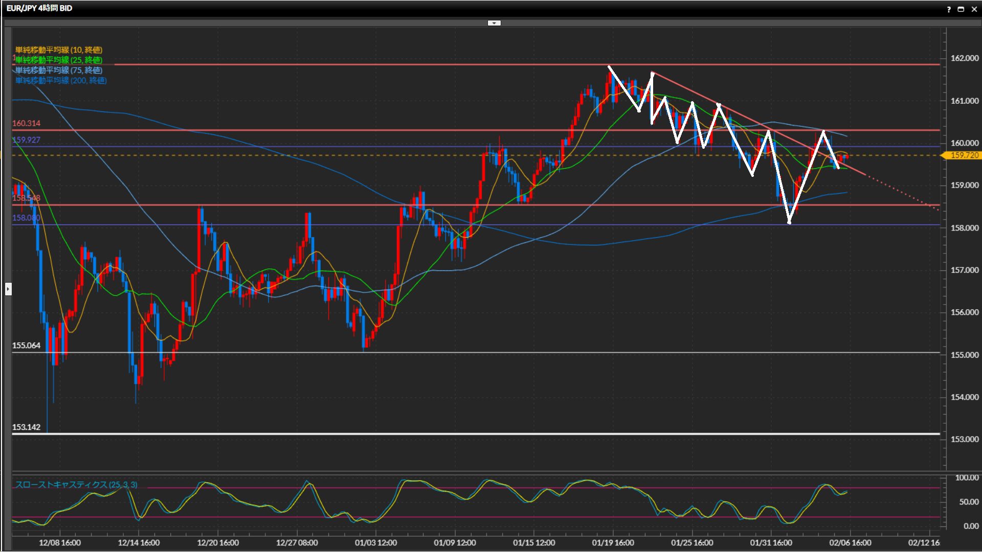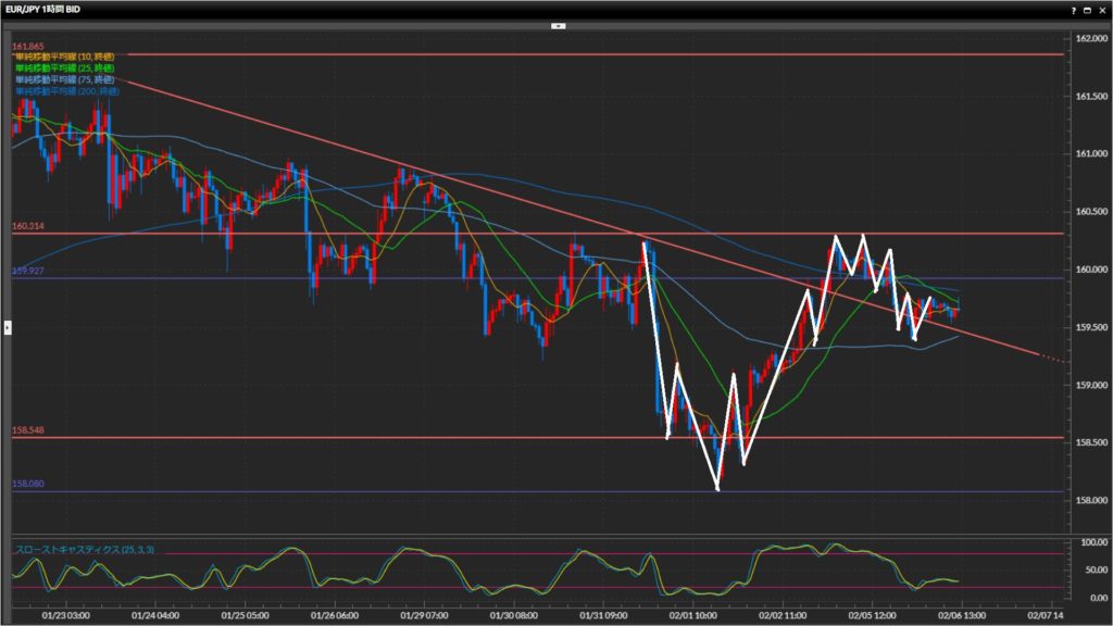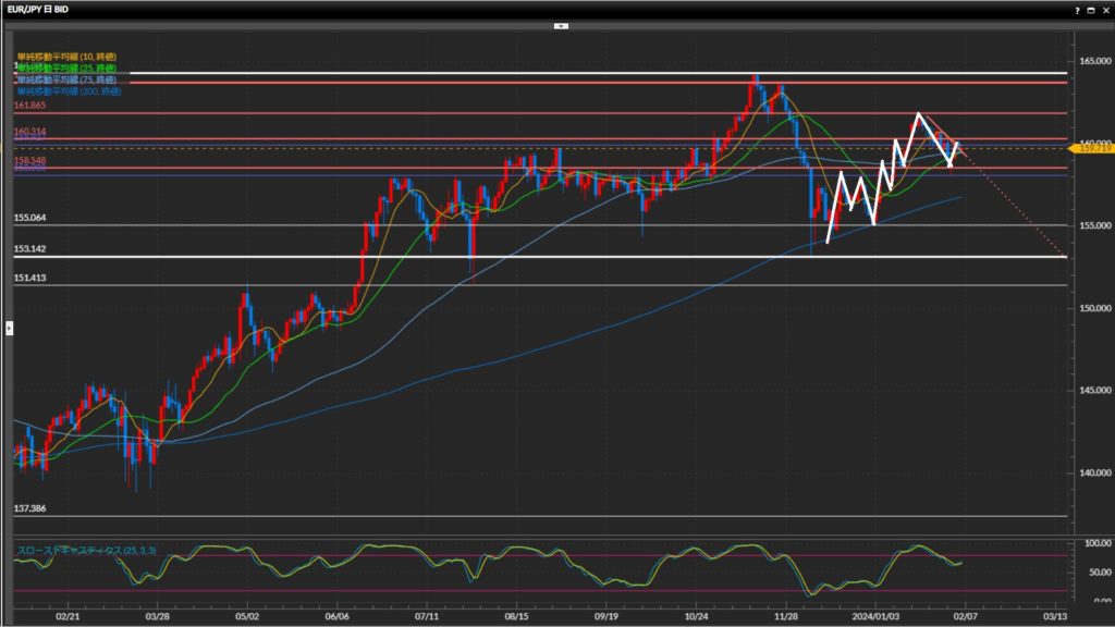 直近高値160.31円手前まで上昇したものの、レジスタンスされたため下目線は継続。