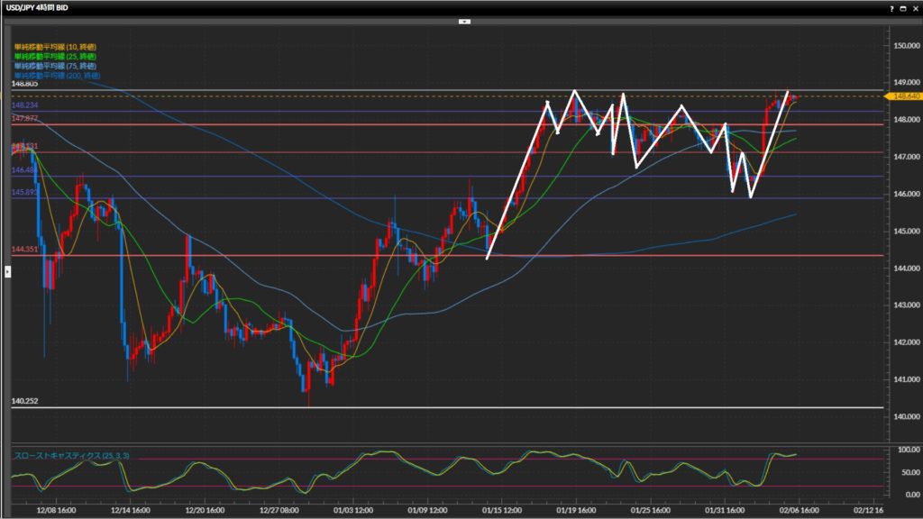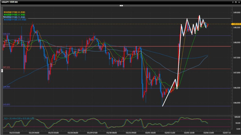 先週末は安値145.89円をつけてから一気に日足の高値148.81まで上昇。
