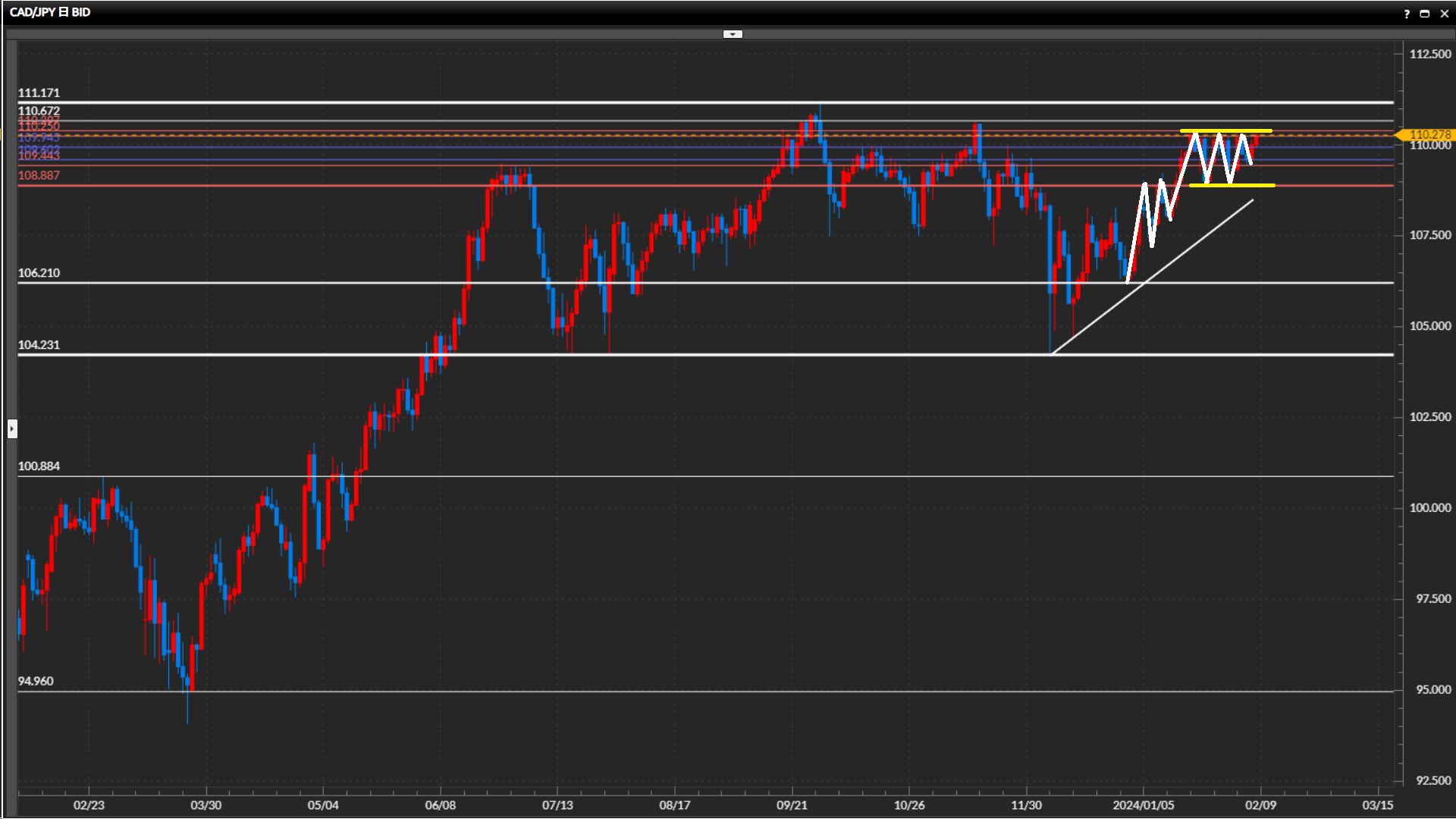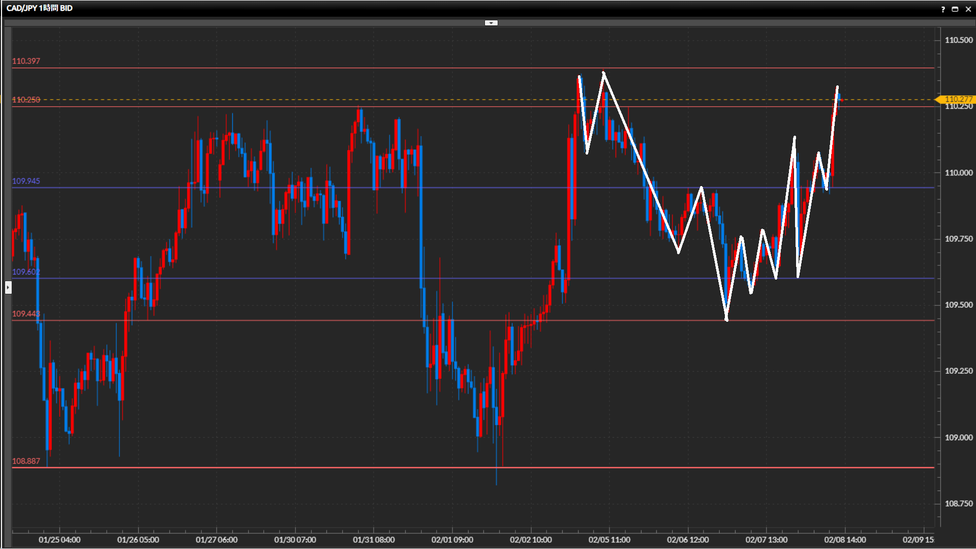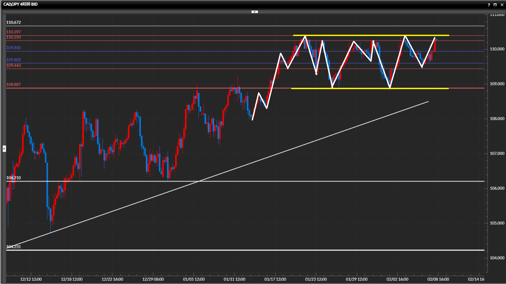 108.89円-110.40円のレンジ内で、直近は中間付近で安値を切上げ、上値ラインまで上昇。