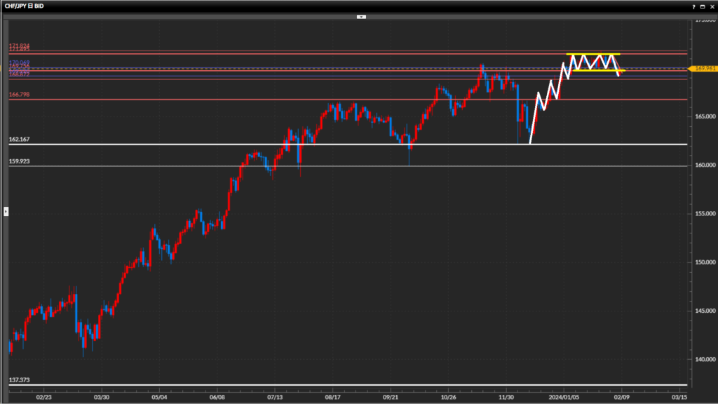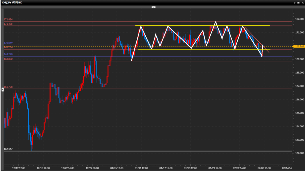 • フラン円日足〜4時間足はレンジ、1時間足は下目線終了。